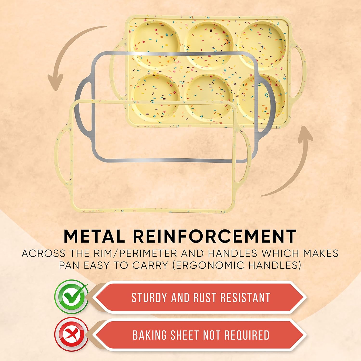 - SAFE, FLEXIBLE & DURABLE DESIGN – These silicone cupcake pans for baking are oven safe (up to 446°F), freezer safe, dishwasher safe, and microwave safe. The reinforced metal frame and ergonomic handles make each cupcake tray easy to carry—no baking sheet required!