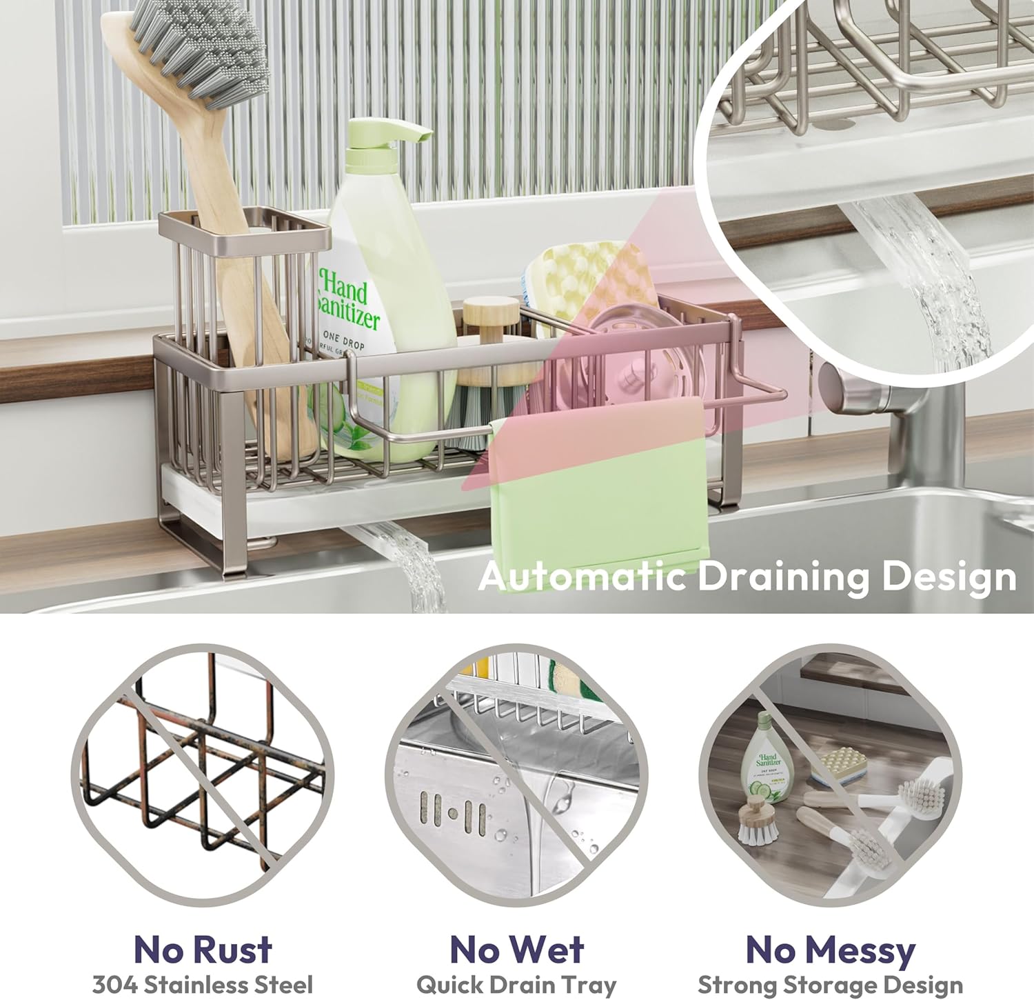 - [Large Storage Space Kitchen Essentials]: Our kitchen sink caddy organizer will give you a neat and clean kitchen for its strong storage capacity. Soap holder can hold three brushes, one rubber plug and a sponge, one bottle of soap dispenser-no swinging and no falling