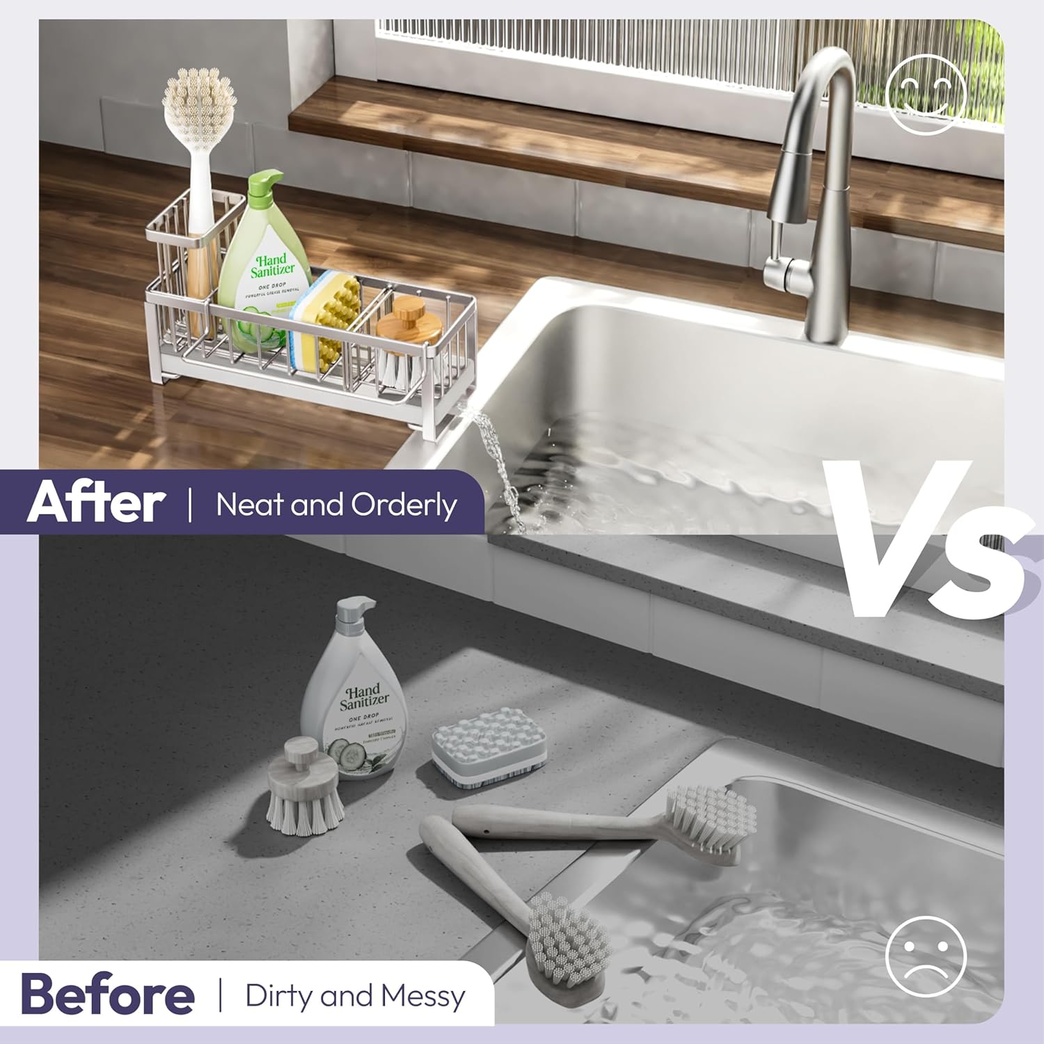 - [Unique Divided Space Sponge Caddy]: The removable baffle design divides the sink caddy into 2 separate storage spaces, you can disassemble at any time according to your need, it's perfect for storing dish soap bottles, sponges, sink stoppers,etc