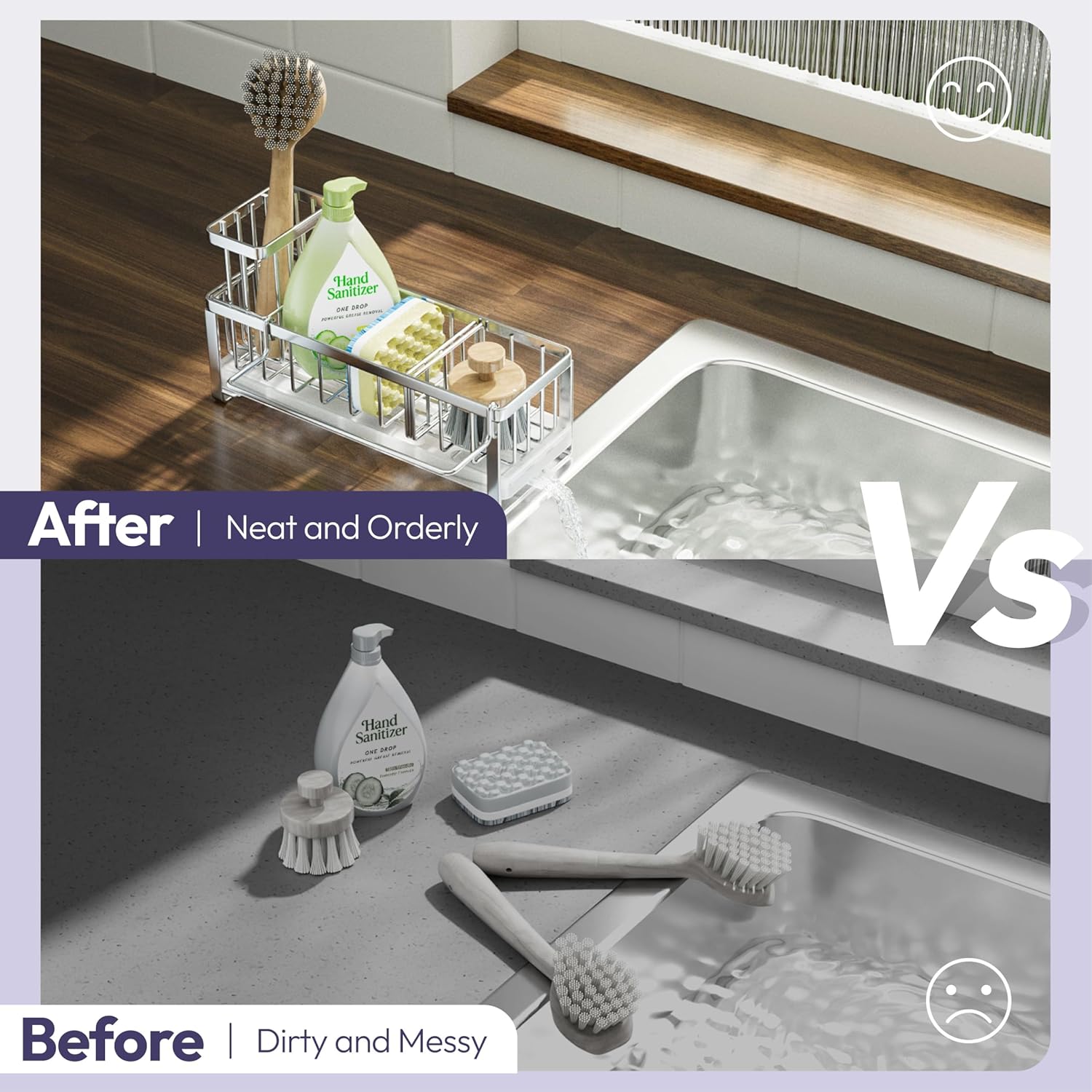 - [Large Storage Space Kitchen Essentials]: Our kitchen sink caddy organizer will give you a neat and clean kitchen for its strong storage capacity. Soap holder can hold three brushes, one rubber plug and a sponge, one bottle of soap dispenser-no swinging and no falling