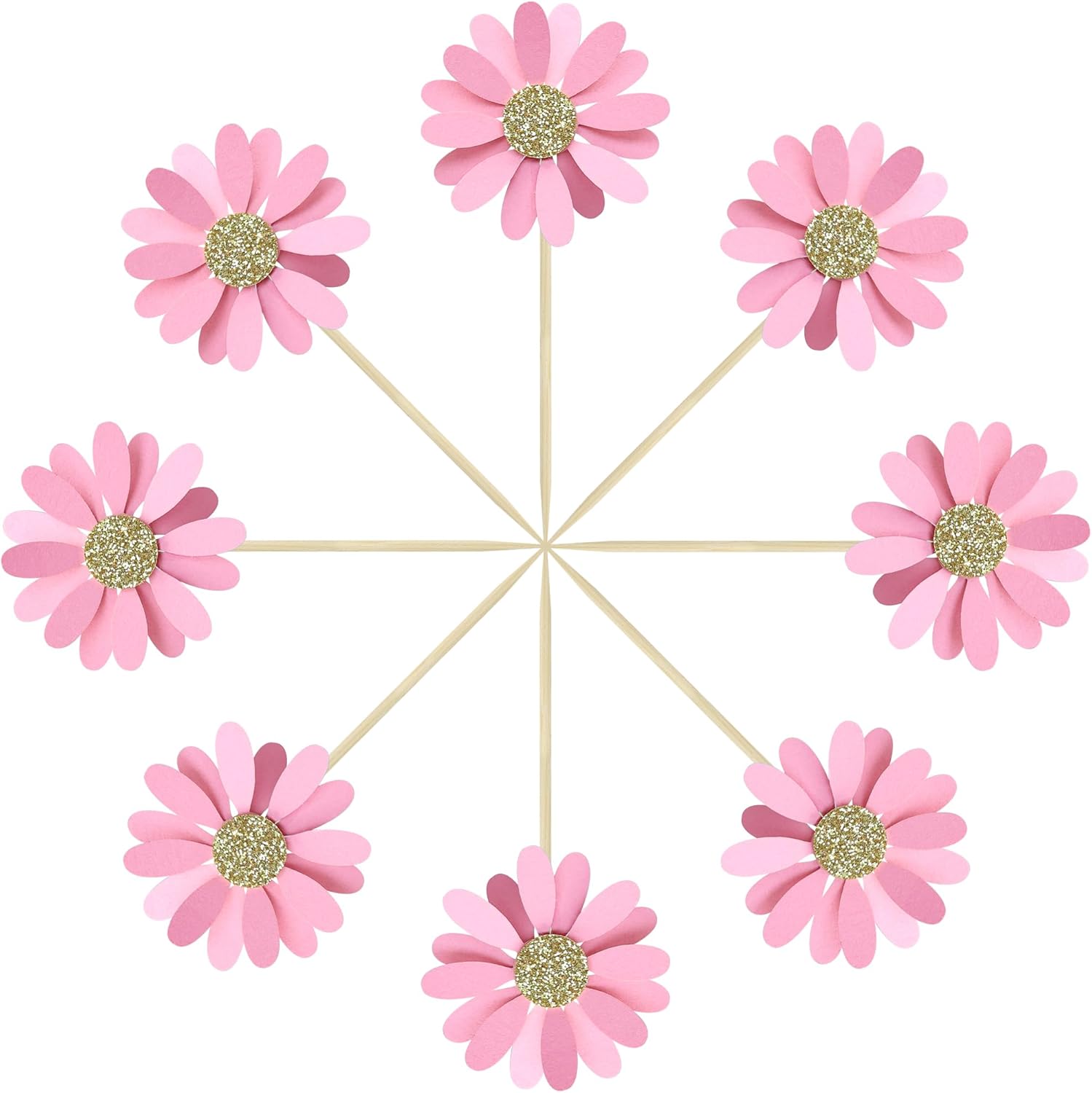 24Pcs Daisy Cupcake Toppers Flower Cake Topper Decorations Daisy Cake Decorations Chrysanthemum Cupcake Toppers Spring Daisy Flower Cake Picks for Birthday Wedding Supplies Light Pink