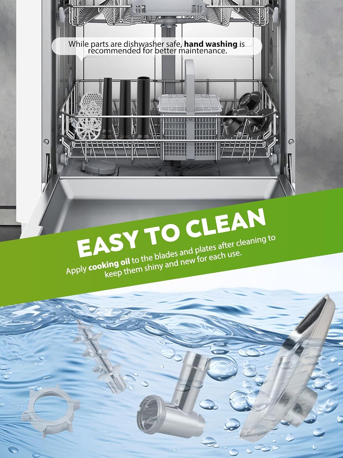 - Easy to Clean: This automatic meat chopper is easy to assemble and disassemble. Cleaning is a breeze, while parts are dishwasher safe, hand washing is recommended for better maintenance. Apply cooking oil to the blades and plates after cleaning to keep them in top condition, shiny and new for each use