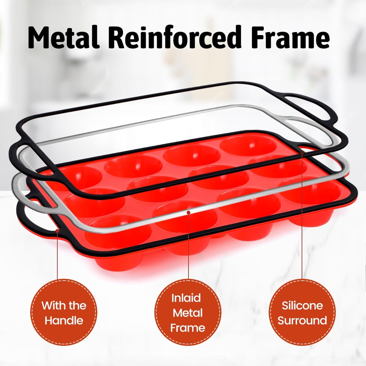- Reinforced Silicone Muffin Pan: This muffin pan features an embedded stainless steel frame, enhancing its stability and resistance to warping, preventing batter spillage during transportation