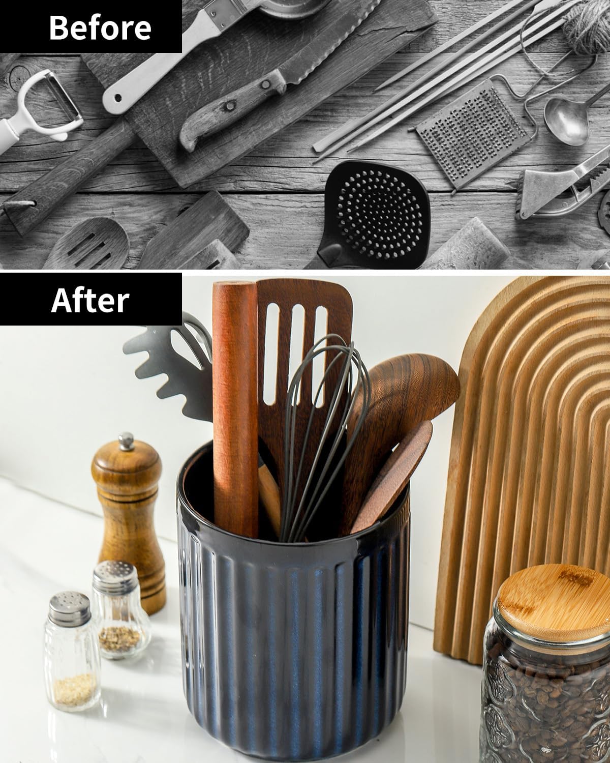 - Textured Elegance: This ceramic navy blue utensil holder features a ribbed texture with lighter flecks, enhancing your kitchen decor and adding a tactile touch that enriches your countertop’s charm