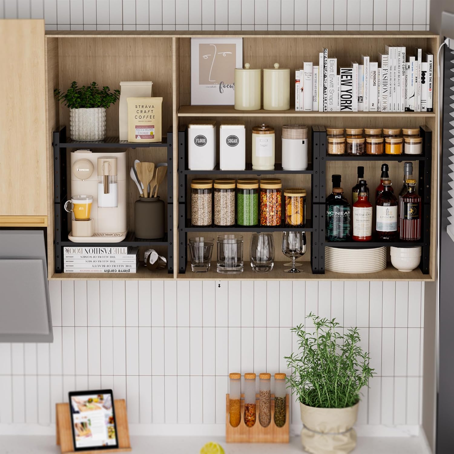 Expandable Shoe Rack Stackable Metal Pantry Storage Shelves Stand Adjustable Height Cabinet Shelf Organizer Racks Spice Shelving(1PACK/BLACK,LARGE)