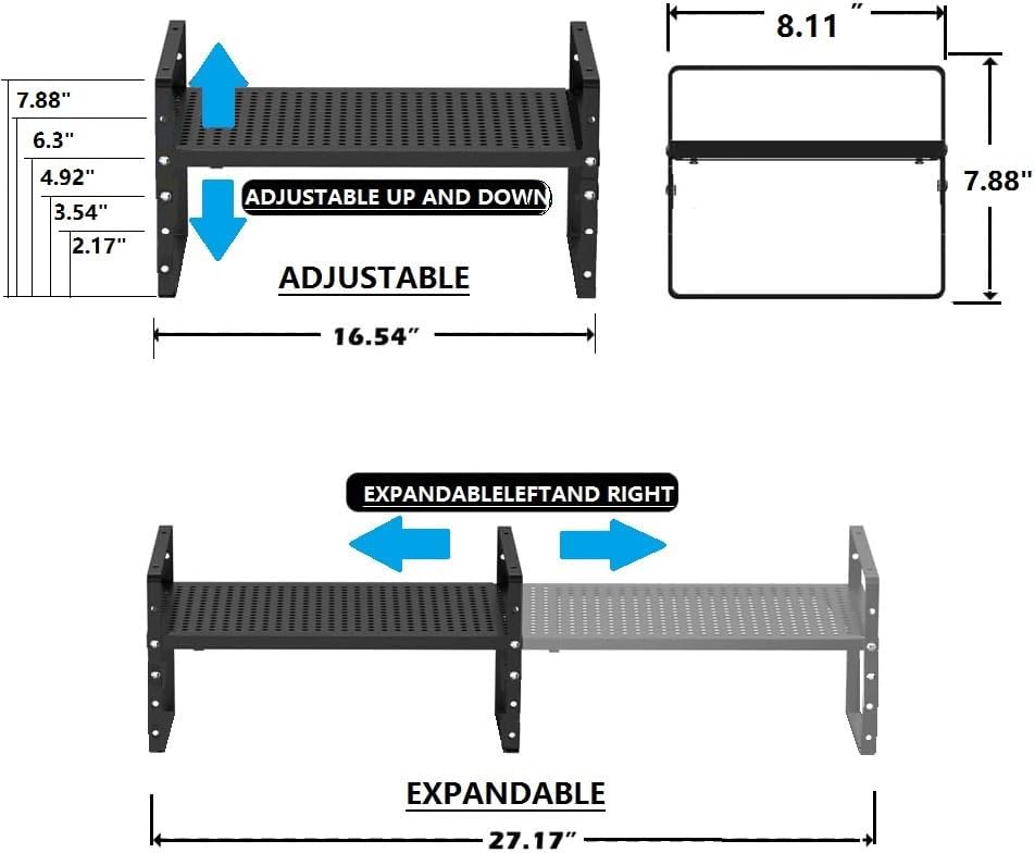- ⭐【Expandable & Stackable Cabinet Organizer】This cabinet shelf is expandable, allowing you to adjust the width and height to suit your needs.The measures are 8.11"Dx16.54~27.17"Wx2.17~7.88"H.There are 5holes for each side which can be adjusted the width from 16.54" to 27.17".It also can be easily stacked up to a 2 or 3 tier kitchen organizer.