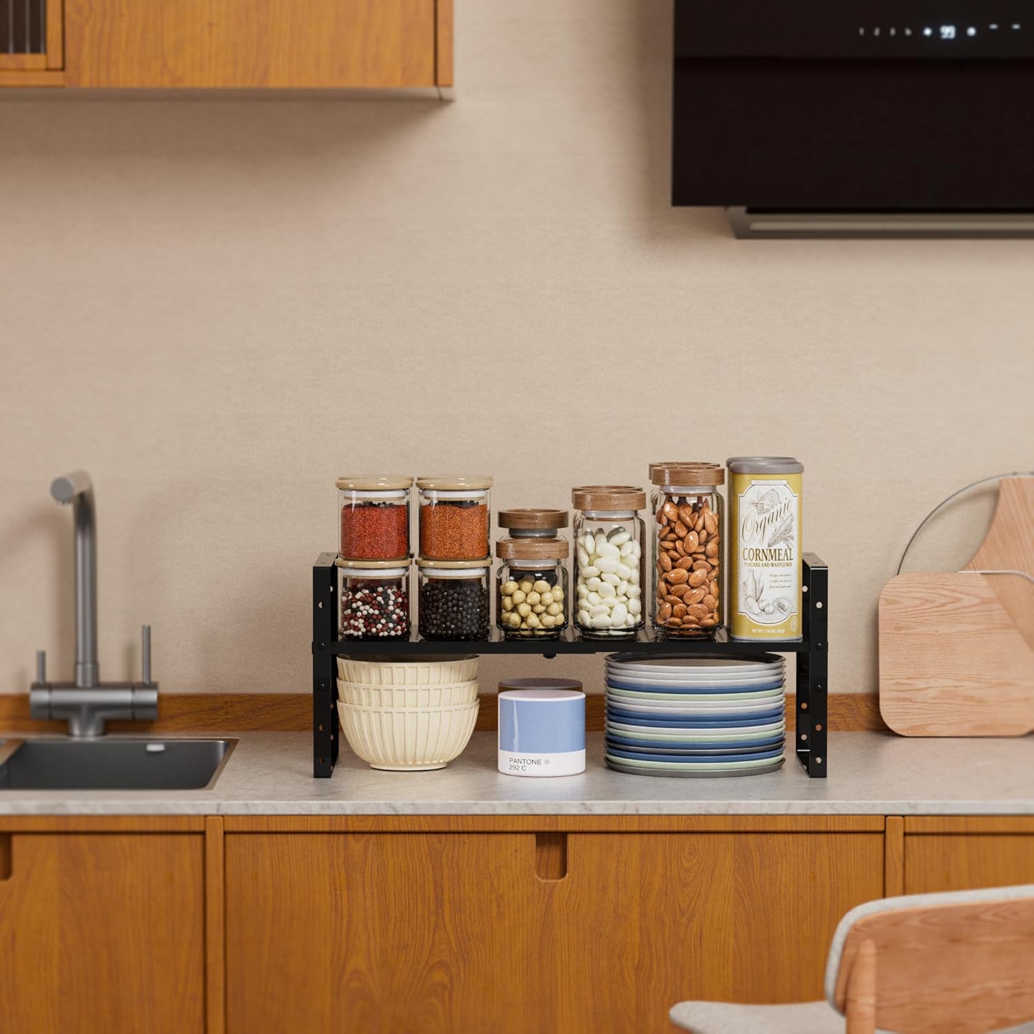 - ⭐【Versatile Spice Shelf for Cabinet】This adjustable kitchen counter stand shelf instantly create additional storage space.It is very helpful to organize the Bottles, Cans, Bowls, Plates, Pans, Soup pots in kitchen,Pantry and cupboard.Also a great space-saving option for the bedroom, study, sitting room, bathroom, and more.