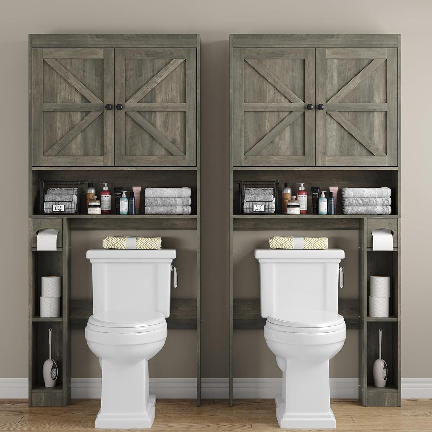 Furnideco 32.3''W Over The Toilet Storage Cabinet with Barn Doors, Over Toilet Shelf Farmhouse Storage Cabinet Space Saver with Toilet Paper Holder & Adjustable Bottom Bar, Gray