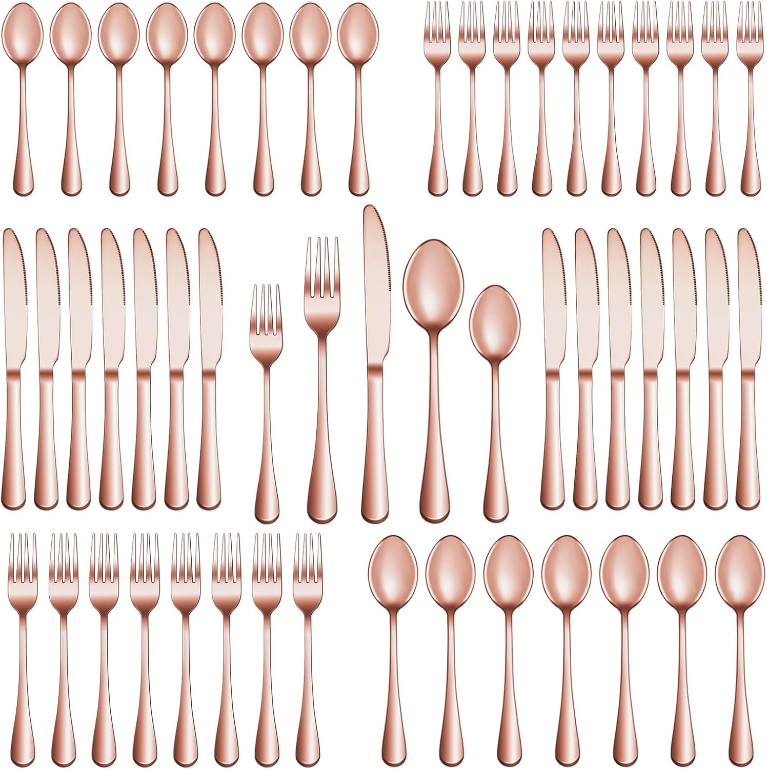 - 20 PCS ROSE GOLD SILVERWARE SET SERVICE FOR 4: This rose gold silverware set comes with 4 Dinner Forks, 4 Dinner Spoons, 4 Dinner Knife, 4 Salad/Dessert Fork and 4 Dessert/Tea Spoons, essential for families or restaurants. The set is also an irreplaceable dining tool whether it is for daily use or for preparing dinners or parties.