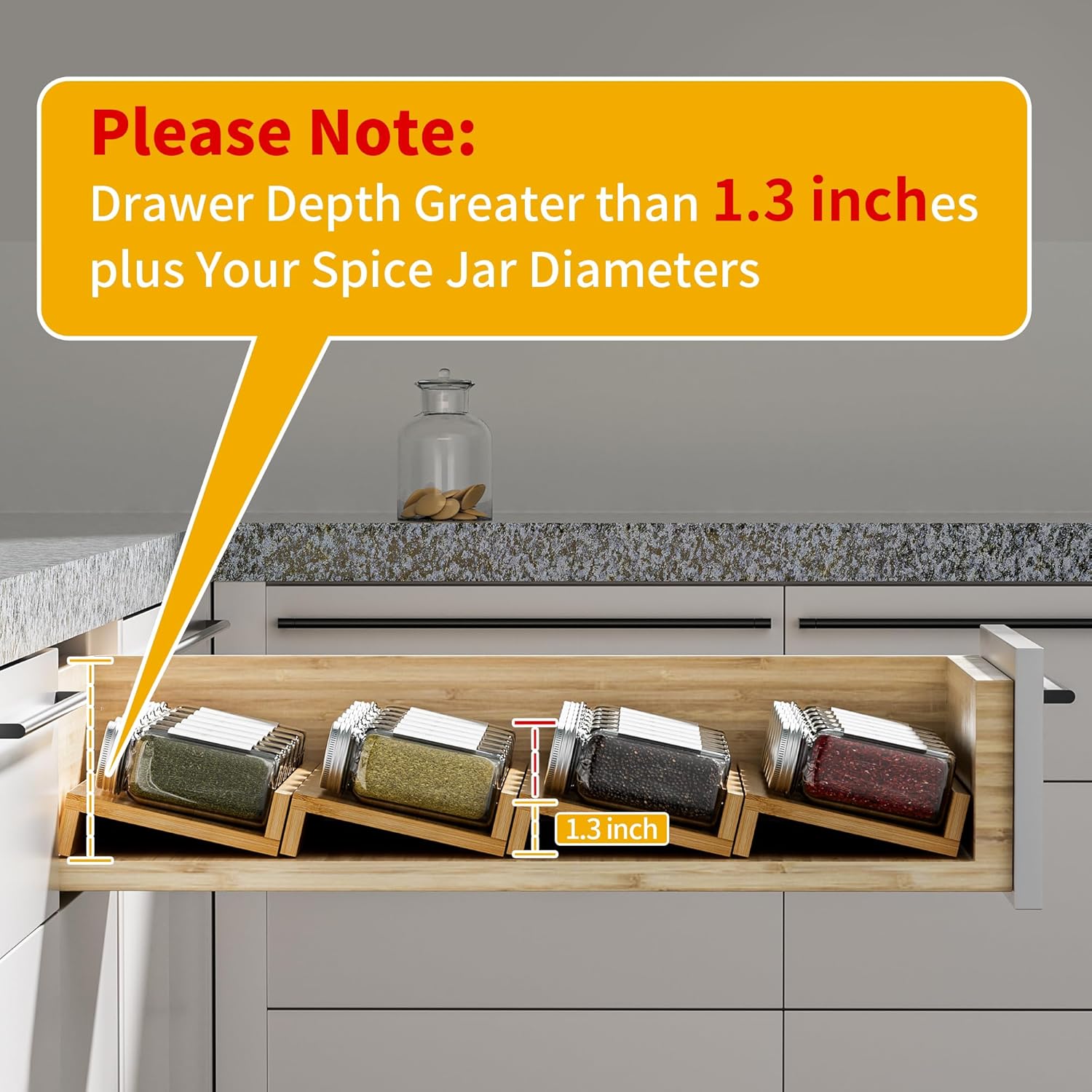 - Spacious Storage Capacity - Our bamboo seasoning organizer can hold up to 64 standard 4 oz spice jars (jars not included), thanks to its tiered design. Each piece measures 13" x 4.7" x 1.6"(8 Pieces), providing ample space for organizing your spice collection in your kitchen drawer or cabinet