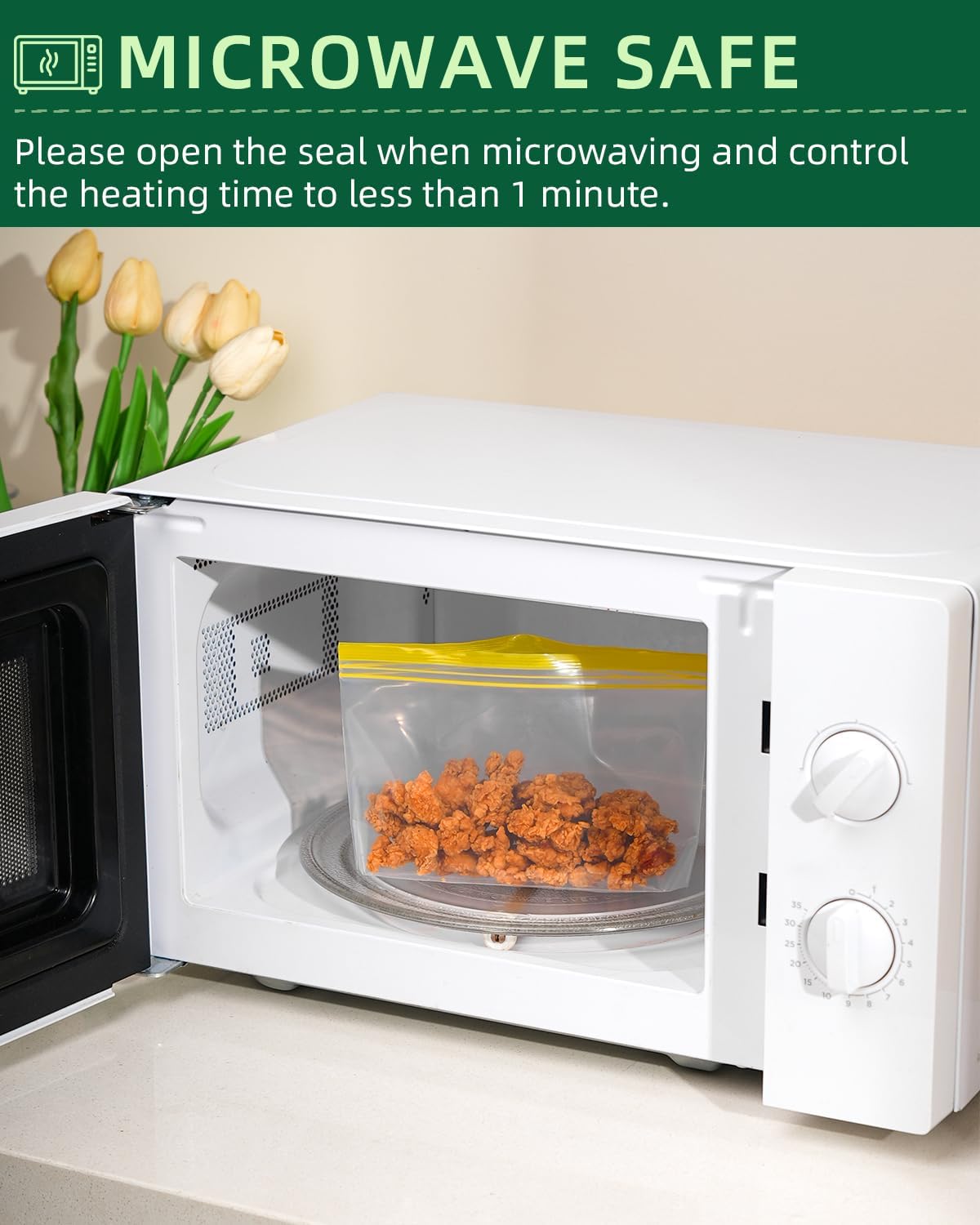 - FREEZER & DISHWASHER SAFE, MICROWAVE FRIENDLY: Thanks to innovative upgrades to materials , the reusable silicone freezer bags are dishwasher safe, freezer safe and microwave friendly. The silicone bags reusable storage can lock out freezer burn while keeping food fresh and full of taste, perfect for freezing meat, chicken, fish, fruits, and vegetables. Please allow steam to escape when microwaving and don't microwave for more than 1 minute.