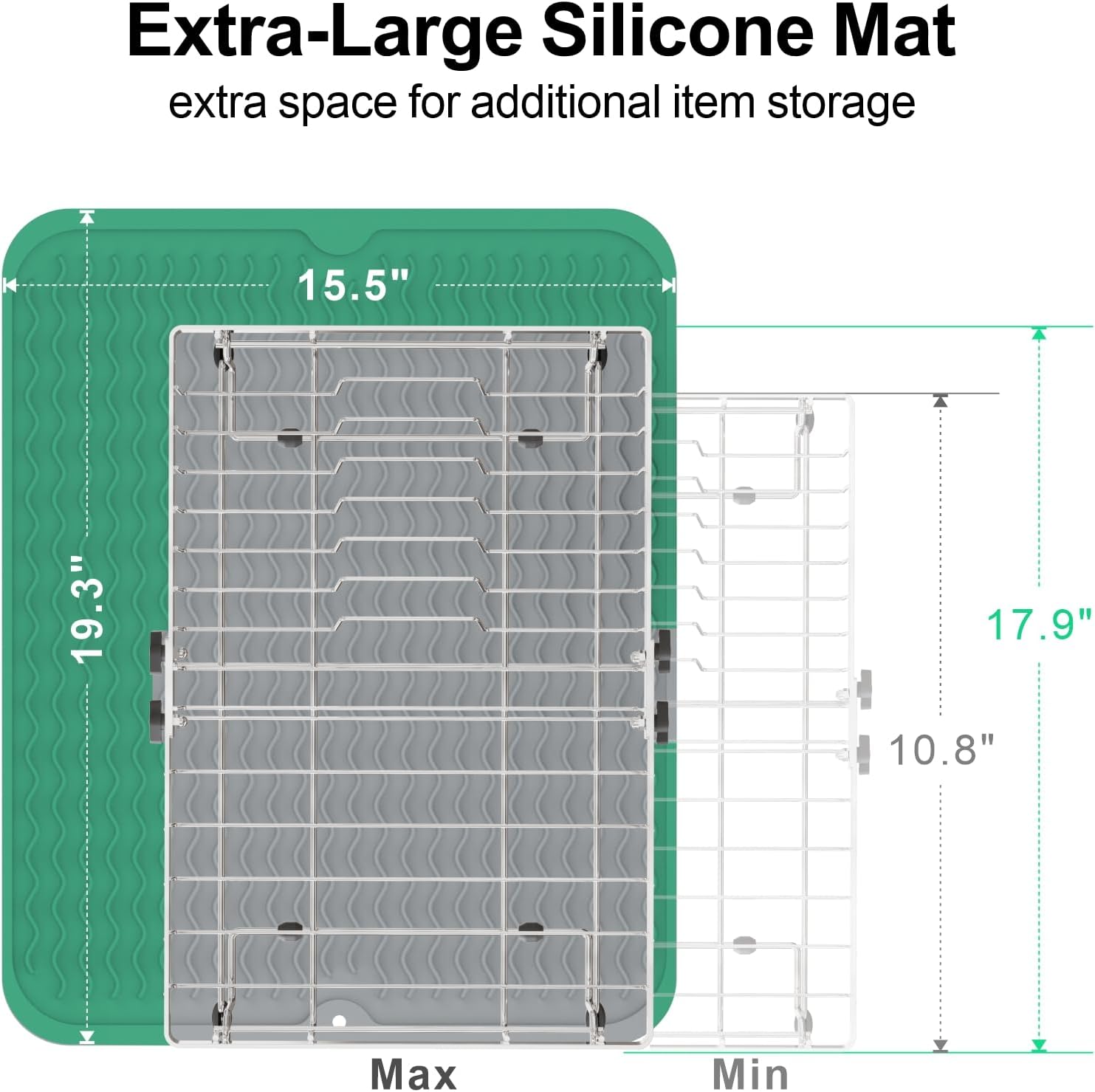 - Silicone Sink Drying Mat: Includes a food-grade large silicone sink mat measures 19.3" x 15.5". With heat resistance up to 428°F, it safely holds hot cookware to protect both your sink and countertop from scratches and heat damage. The mat's raised wavy lines promote air flow, allowing inverted utensils to dry faster. Thoughtful raised edges of mat prevent water spills and keep your workspace dry and tidy.