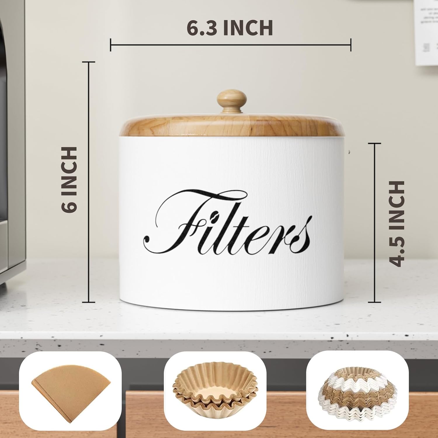 - 【Keeps Filter From Losing Shape】: This round coffee filter holder measures 6.3" in diameter x 6" high, large can keep your coffee filters from losing shape and adds class to your home or coffee bar. Add style and functionality with this rustic farmhouse coffee bar organizer.