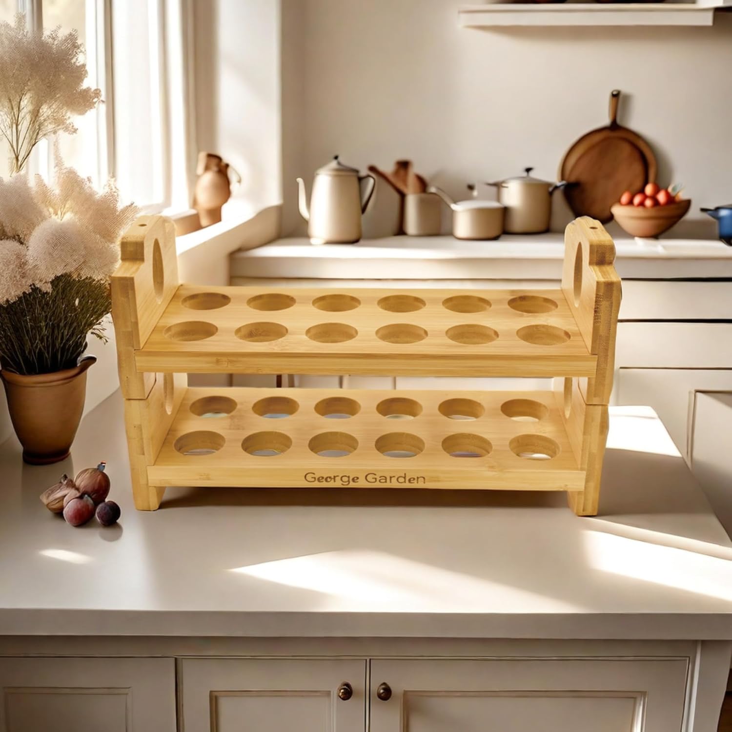 - UNIQUE BAMBOO EGG HOLDER - This egg holder is crafted from bamboo wood, which not only serves well as an egg tray holder, effectively saving valuable space, but also is an ideal rustic decoration for your kitchen countertop.