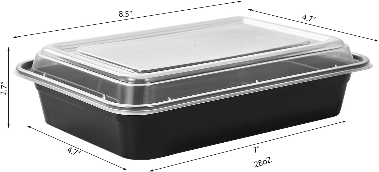 50 Pack Meal Prep Plastic Food Storage Containers With Lids 28 oz 1 Compartment Black Rectangular To Go Lunch Prepping Boxes BPA-Free Microwavable Freezer Safe Stackable (Formerly FULING)