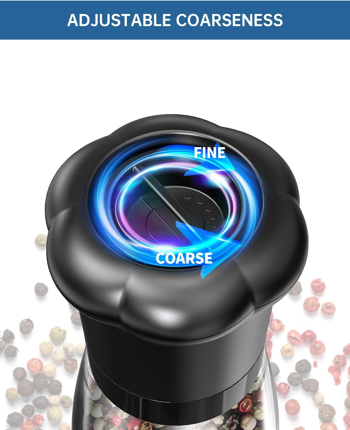 - ADJUSTABLE COARSENESS - The grind size adjustment is controlled by the small, central knob on the top—twisting it clockwise produces finer grinds, while counterclockwise yields coarser results. However, the top section also includes an outer ring, which is solely for activating the grinding mechanism (rotating this ring pushes peppercorns through the burrs to produce powder, but it cannot adjust grind size).