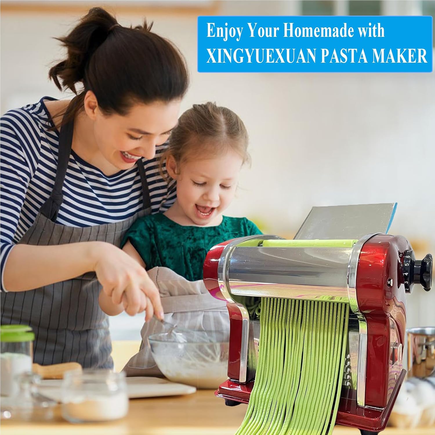 - 【FOOD GRADE STAINLESS STEEL】-XINGYUEXUAN electric noodles maker machine is 110V/135W with a safer U.S. regulatory separate triangle plug. The body is made of full steel plate frame, the gear, and pasta cutter being stainless steel. It has a waterproof on and off switch that is covered with a soft clear button cover to keep water out of the electronics should you spill. You can experiment with eggs, vegetable juices, and various types of flours to create healthy and flavorful gourmet pasta.