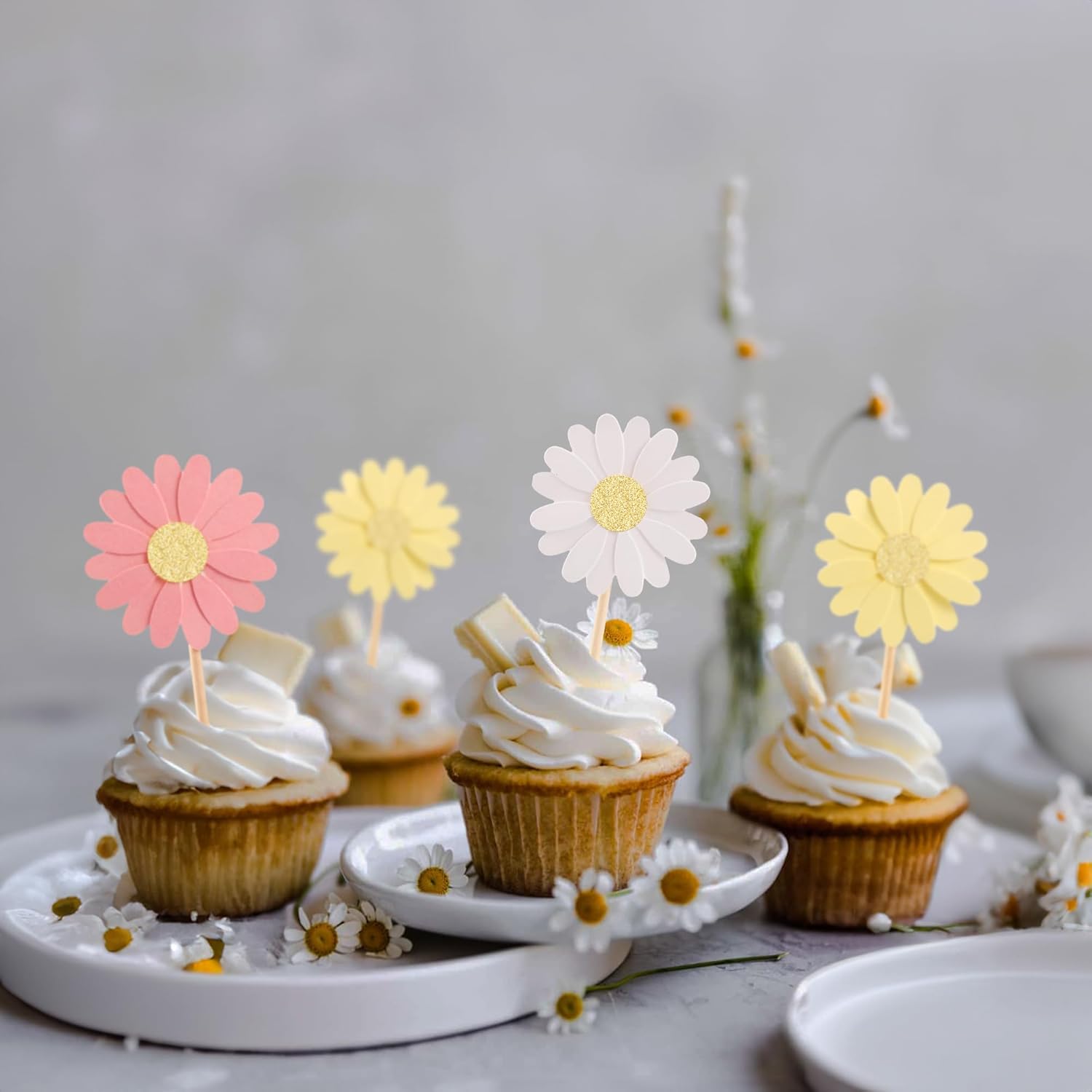 - 【Upgrade Quality】: 24Pcs Daisy Flower Cupcake Toppers are made of 300g card stock and 100% food grade bamboo stick, not easy to deform and fade, smooth edges without burrs, makes Daisy Flower cupcake toppers give you a wonderful visual enjoyment. It is durable enough for long lasting use.