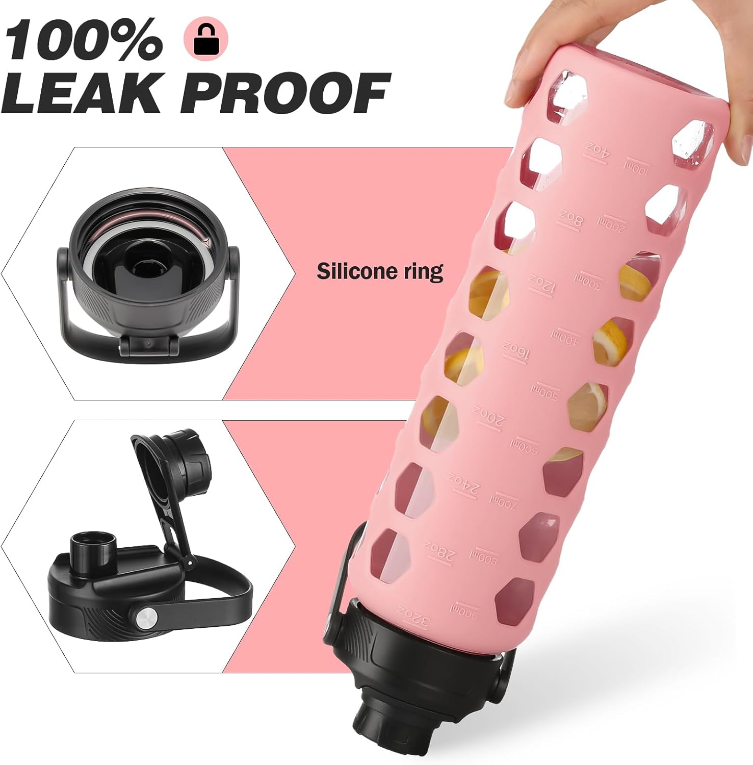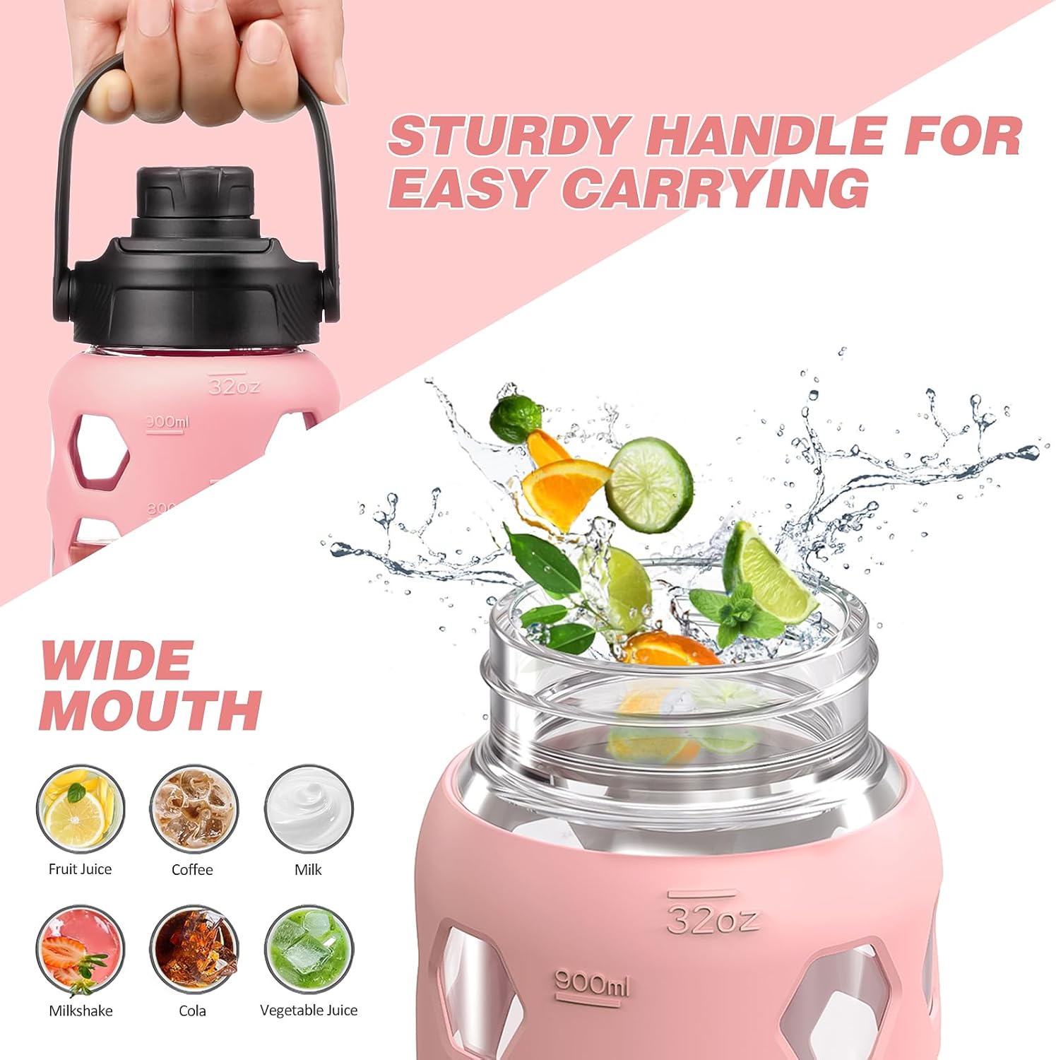 MUKOKO Glass Water Bottles, 32oz Glass Tumbler with Straw, Drinking Bottles with 2 Lids-Handle Spout Lid&Bamboo Straw Lid, Motivational Water Bottle with Time Marker and Silicone Sleeve, 1 Pack-Pink