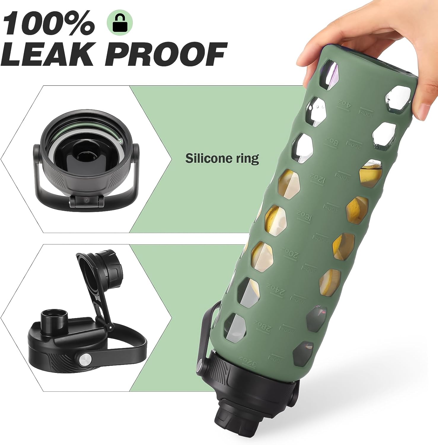 MUKOKO Glass Water Bottles, 32oz Glass Tumbler with Straw, Drinking Bottles with 2 Lids-Handle Spout Lid&Bamboo Straw Lid, Motivational Water Bottle with Time Marker and Silicone Sleeve, 1 Pack-Olive