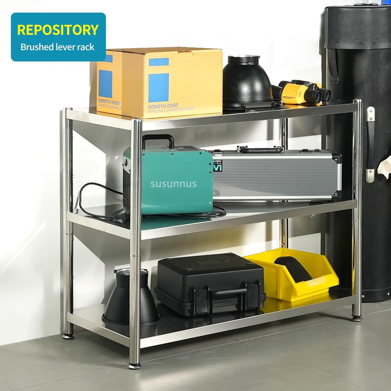 susunnus 3-Tier Stainless Steel Shelf, Heavy Duty Shelving for Kitchen, Garage, Industrial Storage, Kitchen Shelves Adjustable Feet, Easy to Clean(35.8in*15.8without Guardrails)