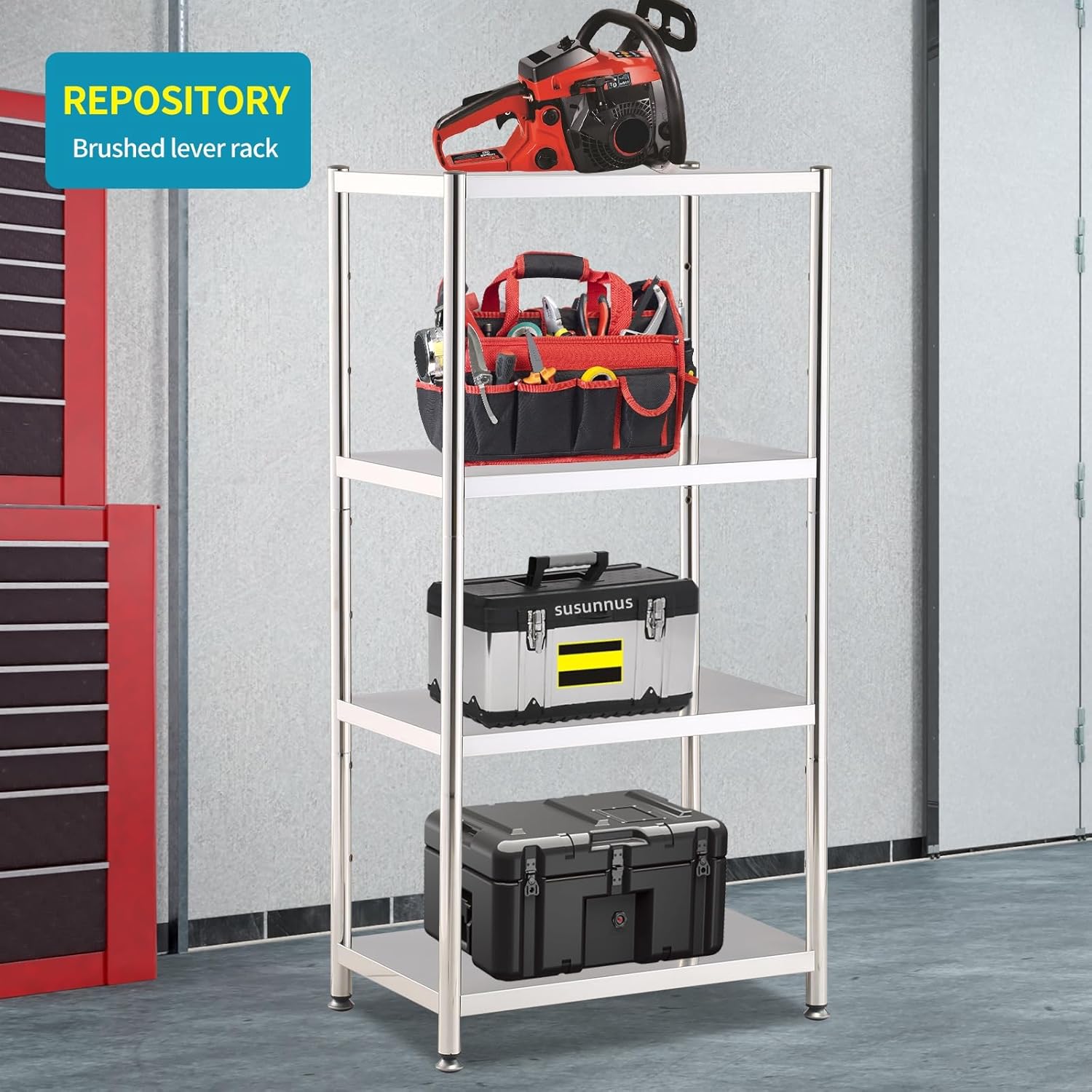 susunnus 4-Tier Stainless Steel Shelf, Heavy Duty Shelving for Kitchen, Garage, Industrial Storage, Kitchen Shelves Adjustable Feet, Easy to Clean(24.8in*15,8in Without Guardrails)