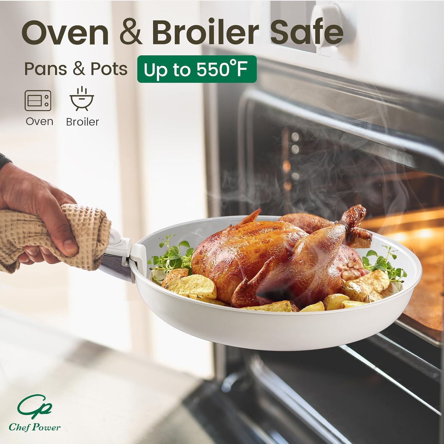 - Easy To Store - Chef Power removable cookware set makes kitchen storage simple, easy to stack and saves 70% space.