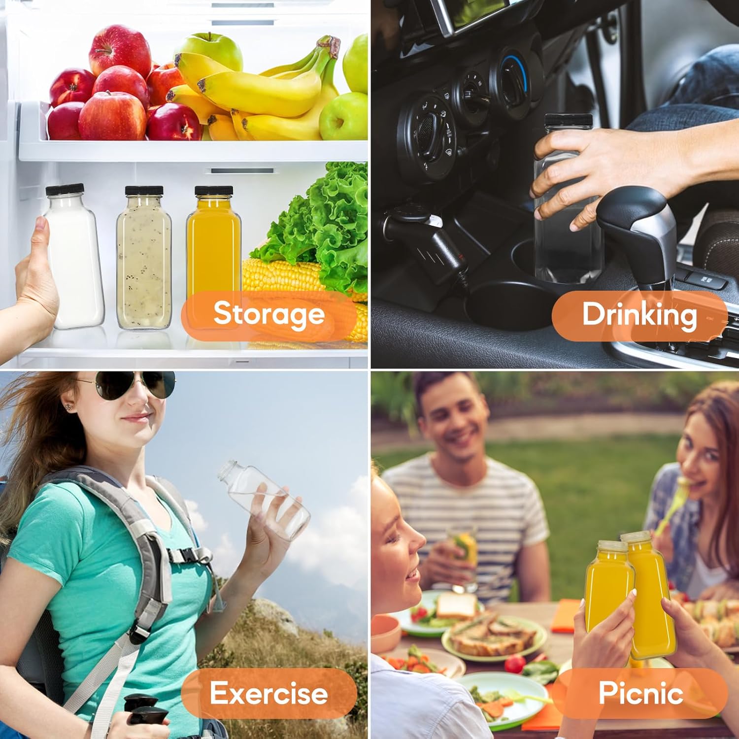 STARSIDE 12 oz Glass Juice Bottles with Lids 6 Pack - Square Reusable Drinking Jars for Juicing, Milk, Kombucha - Includes 1 Bottle Brush, 6 Colored Labels