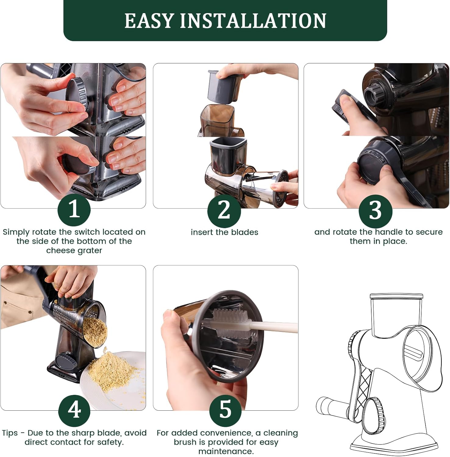 - Safe & Durable: The rotary cheese grater is equipped with sharp, long-lasting 430 stainless steel blades and made with BPA-free, food-grade plastic that’s safe for everyday use. No electricity needed—just hand-crank your way to grated ingredients with ease