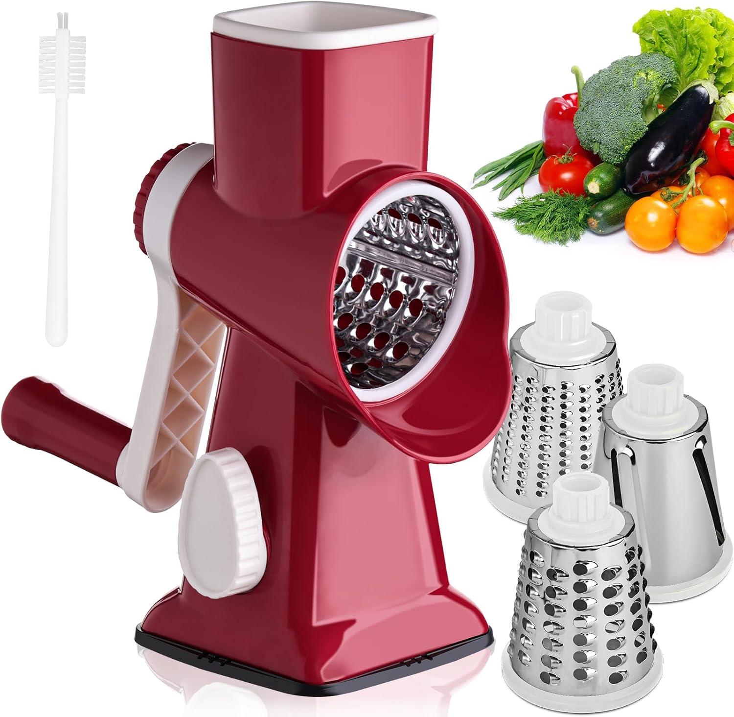 HANSGO Rotary Cheese Grater, Hand Crank Cheese Shredder, Vegetable Slicer for Kitchen, 3 Interchangeable Blades for Potatoes Carrots Onion Zucchini Nuts Chocolate Fruits, Red