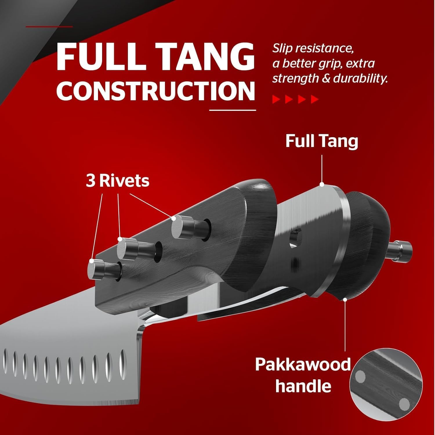 - Full Tang Construction - For superior high quality, durability, strength and professional feel. The molded handle is pinned to only the sides, creating a stable grip and a more balanced blade. With its hidden rivets construction, the knife has a very solid feel and also makes for a visually skeel and modern knife. Not only does this increase your cutting and slicing precision, but also makes it safer to use. As with all sharp objects, keep stored out of the way from children, specifically little kids, and toddlers.