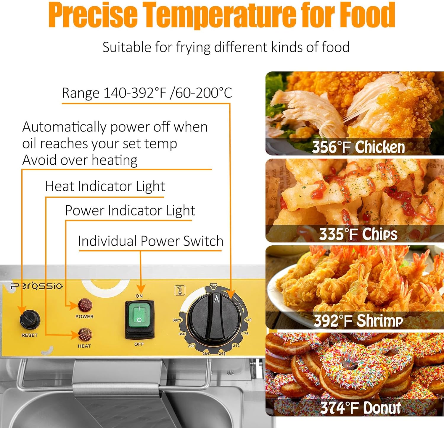 - Precise Temperature Control - Thanks to double temp probes, electric deep fryer can be precisely adjusted from 140°F to 392°F (60-200°C), so it fries food evenly at optimum temp. When the oil reaches your set temp or 446°F/230°C, deep fryer automatically shuts off, no worry of overheating