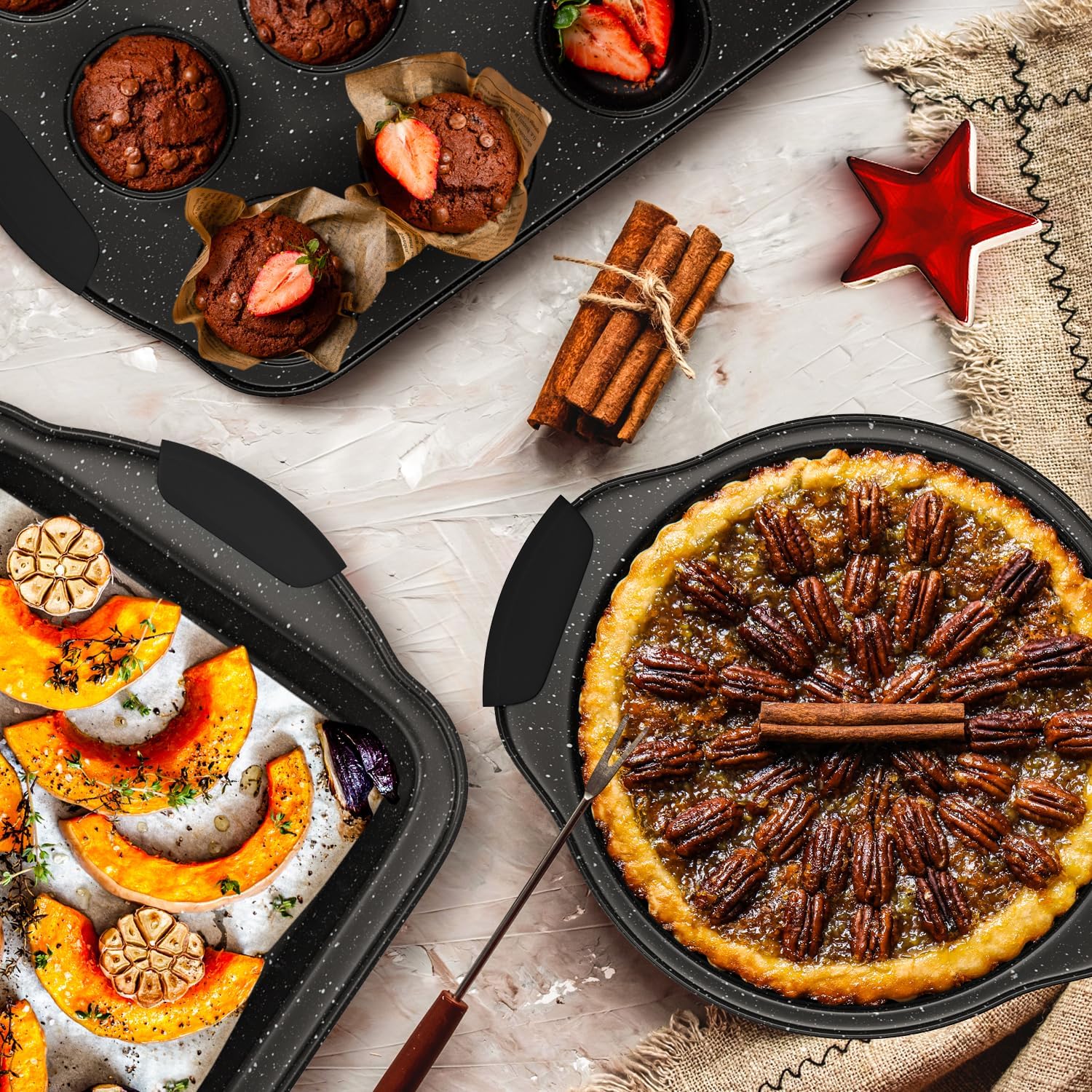 - Premium Nonstick Coating: This baking pan set features a non-toxic nonstick coating inside and out, ensuring your cakes, cookies, and muffins won't stick to the pan, and and making cleaning up a breeze