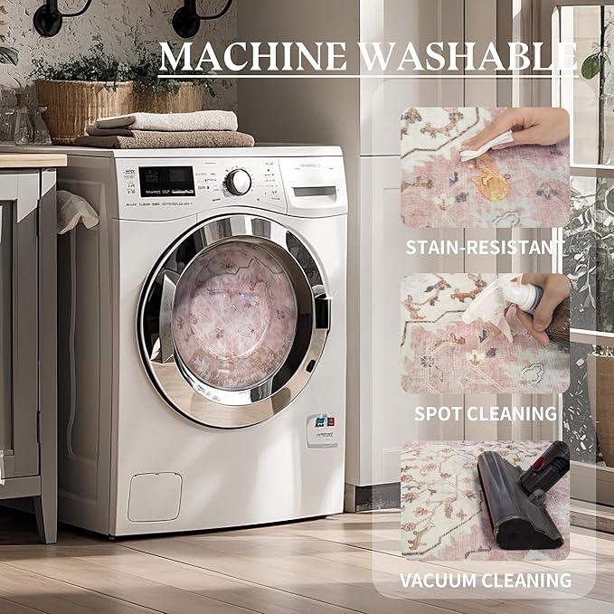 Area Rug for Living Room - Vintage Indoor Machine Washable Rug for Bedroom Dinning Room Floor - Soft Low-Pile Carpet Non-Slip Backing Floral Rugs for Office (Pink, 8' × 10')