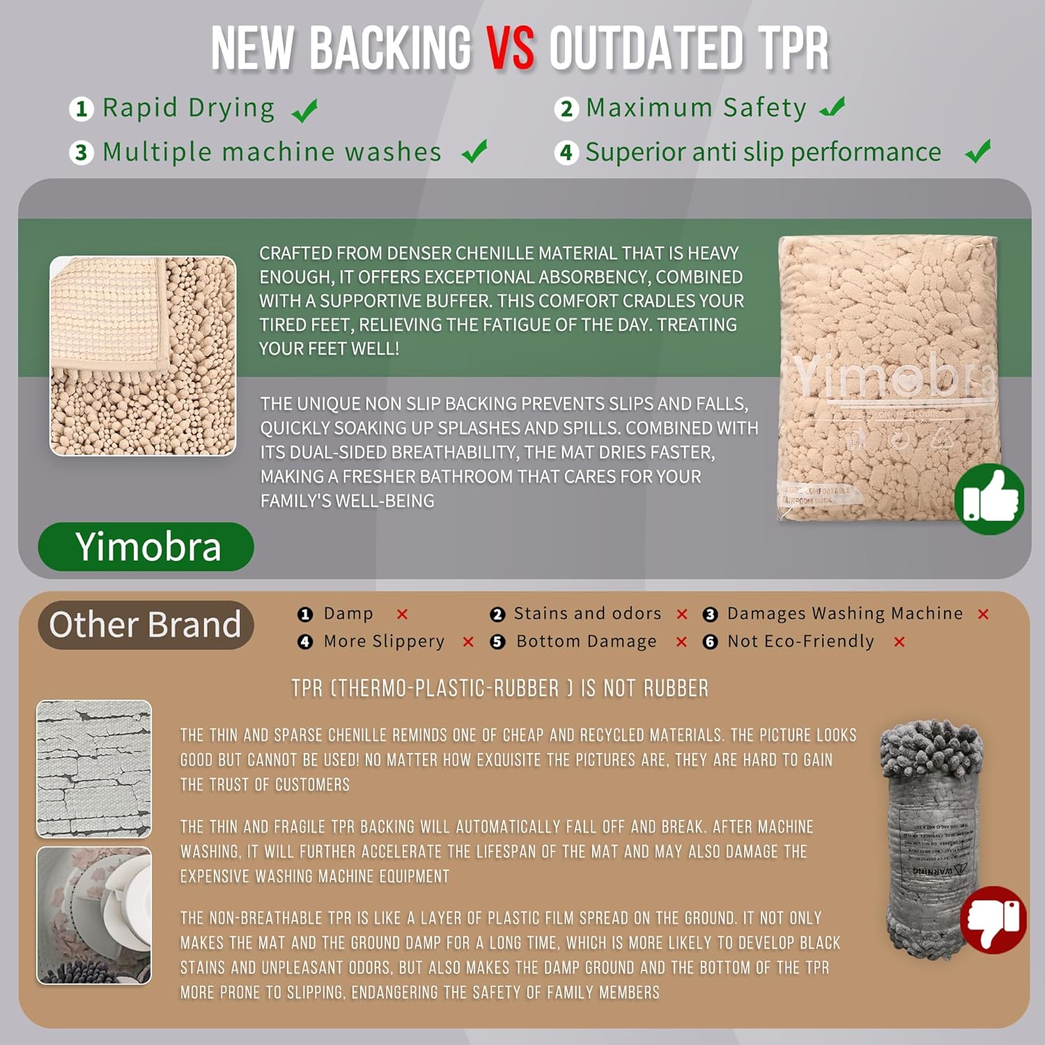 - Total Grip Safety & Quick Dry: Yimobra bath rug features a feather-light yet ultra-grippy hot-melt backing that stays firmly in place on wet surfaces. Its vertical air-channel chenille fibers ensure rapid and complete dryness, providing instant dry safety the moment you step out of the shower. The product is tested for harmful substances, performance, longevity, and emissions in accordance with the OEKO-TEX Standard 100