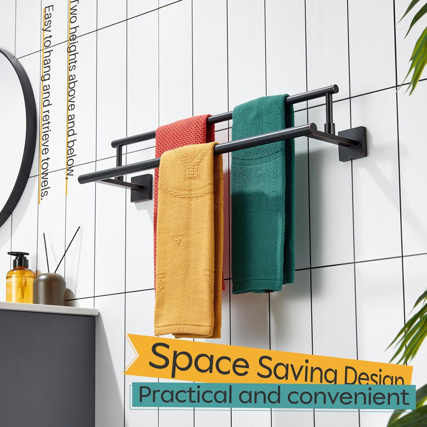 - ◄ MODERN DESIGN ► KOKOSIRI double towel rack with two rails combines elegant square, sleek round, and unique rectangle elements to bring a modern aesthetic to your bathroom, shower room, toilet, kitchen, washroom, pool or garage. You can choose from our series of bathroom hardware for a complete, coordinated look to your place