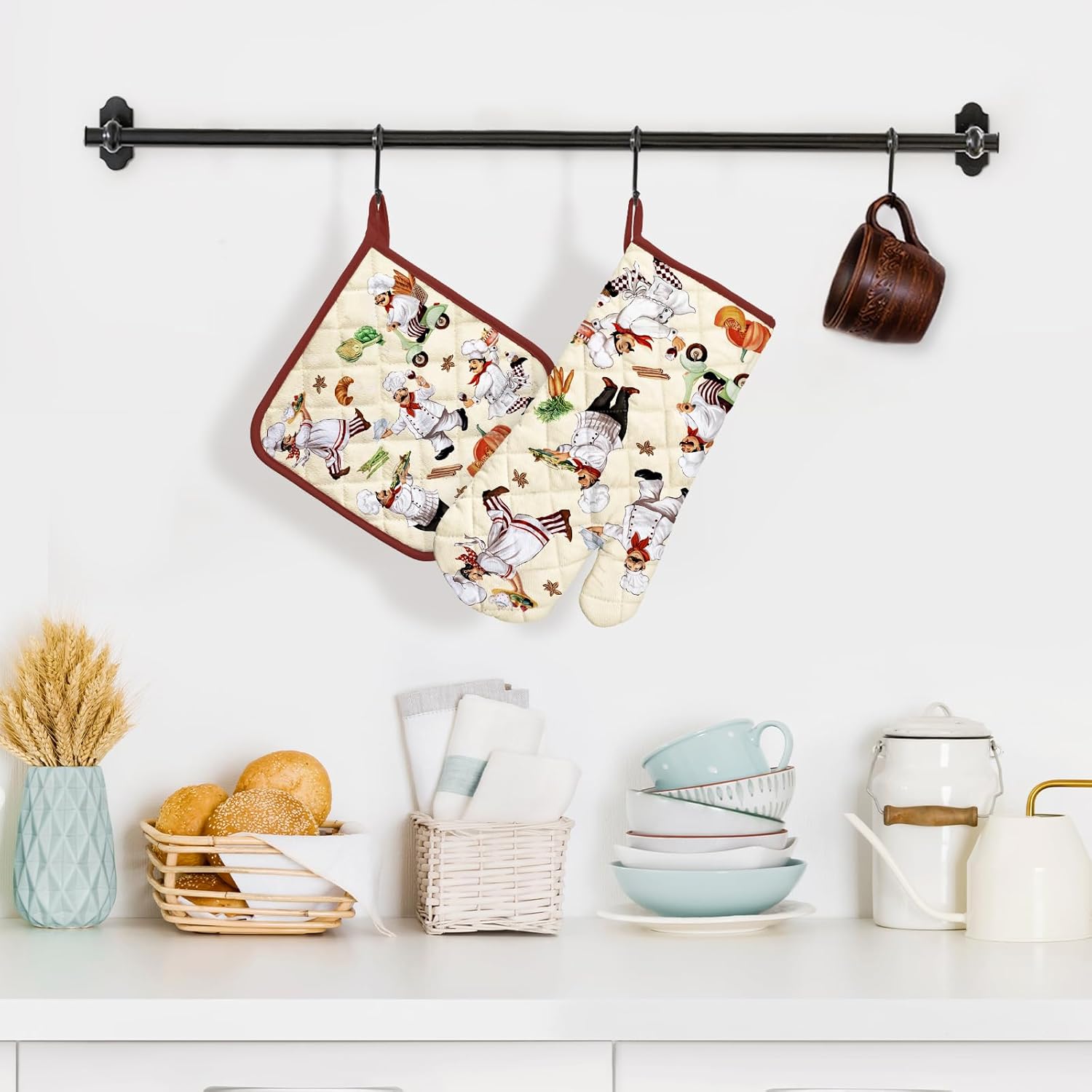 Chef Oven Mitts and Pot Holders Sets 2Pcs, 100% Cotton Heat Resistant, Extra Long Oven Gloves Potholder for Kitchen Cooking Baking Decoration