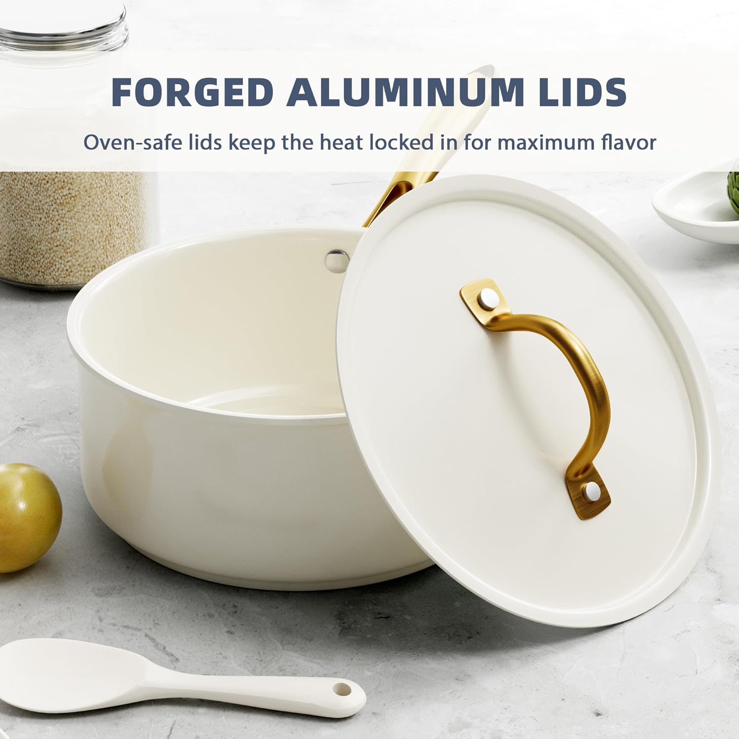 - ULTRA-TOUGH ALUMINUM LIDS: The forged aluminum lids provide extra strength and are crafted with precision, its sealing performance is stronger than other glass lids, thus maximizing the preservation of food flavor.