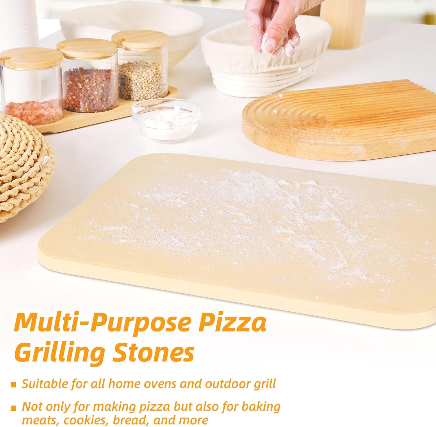 - 15 x 12" Pizza stone is made of 100% natural cordierite, which is FDA-safe, sturdy, durable, odorless, and features excellent thermal stability. It won't crack under high temperatures and can withstand heat up to 1470°F.