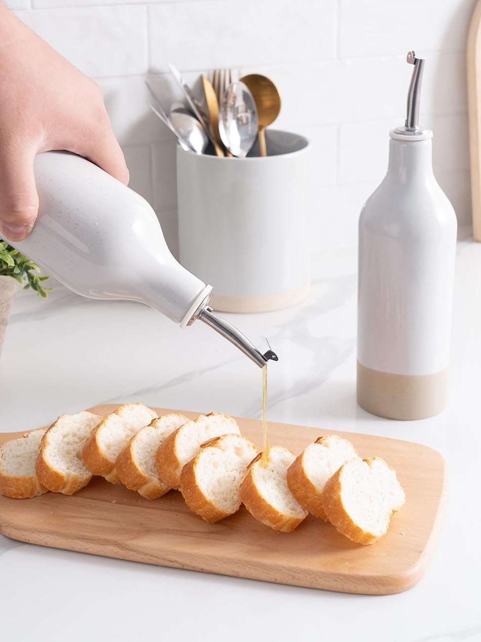- ELEGANT OLIVE OIL DISPENSER BOTTLE - Our ceramic oil dispenser is handmade and batch fired at extremely high temperatures, forming a smooth glaze and providing a resilient surface for strength and durability, easy to clean and dishwasher safe for long-term use