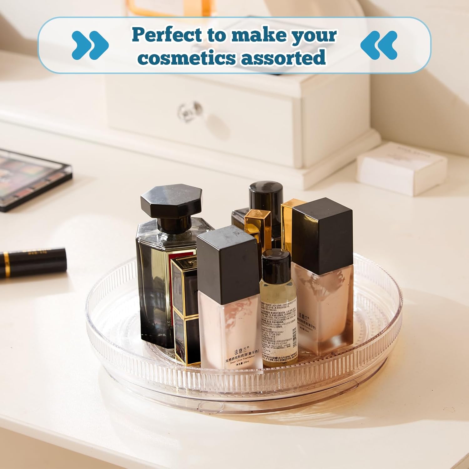 - MULTIPURPOSE ORGANIZER: This versatile Lazy Susan turntable is perfect for a variety of uses. Organize your spices, seasonings, snacks or even display items on a shelf. It also serves as a stylish cosmetics, perfumes holder or a bathroom organizer, keeping your desktop neat and tidy.
