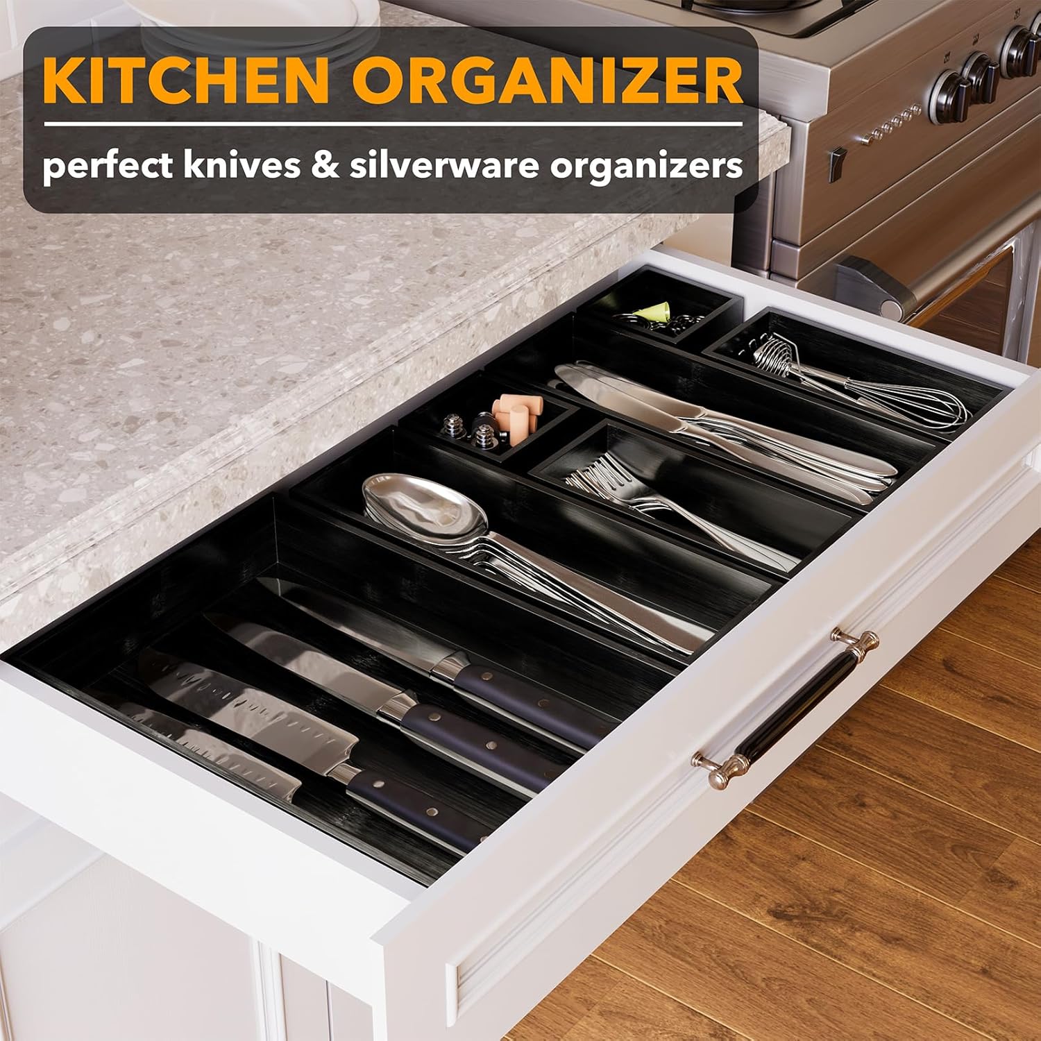 - STURDY CONSTRUCTION - Made of durable solid bamboo; Sturdy enough to hold different sizes utensils and cutlery; Live an organized and sustainable life with this bamboo silverware tray for drawer