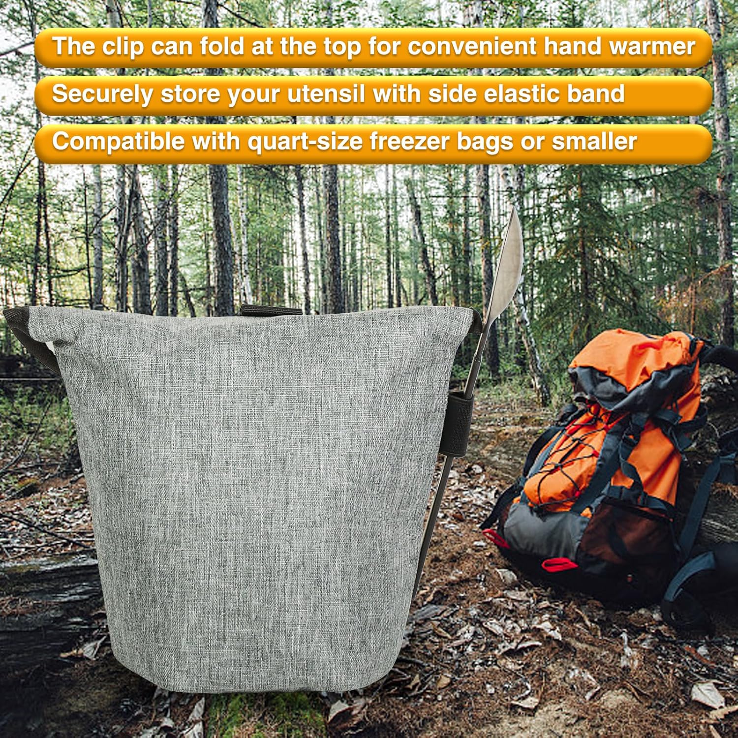 - Easy to Use: Simply place your freezer bag with dehydrated food inside the pouch, add the recommended amount of hot water, seal the bag, and clip the pouch closed. Wait the stated cook time, your delicious, hot meal is ready to enjoy.A convenient elastic band on the side of the pouch allows you to easily store your utensil. After use it, simply wipe the inside or rinse the inside liner and leave to dry