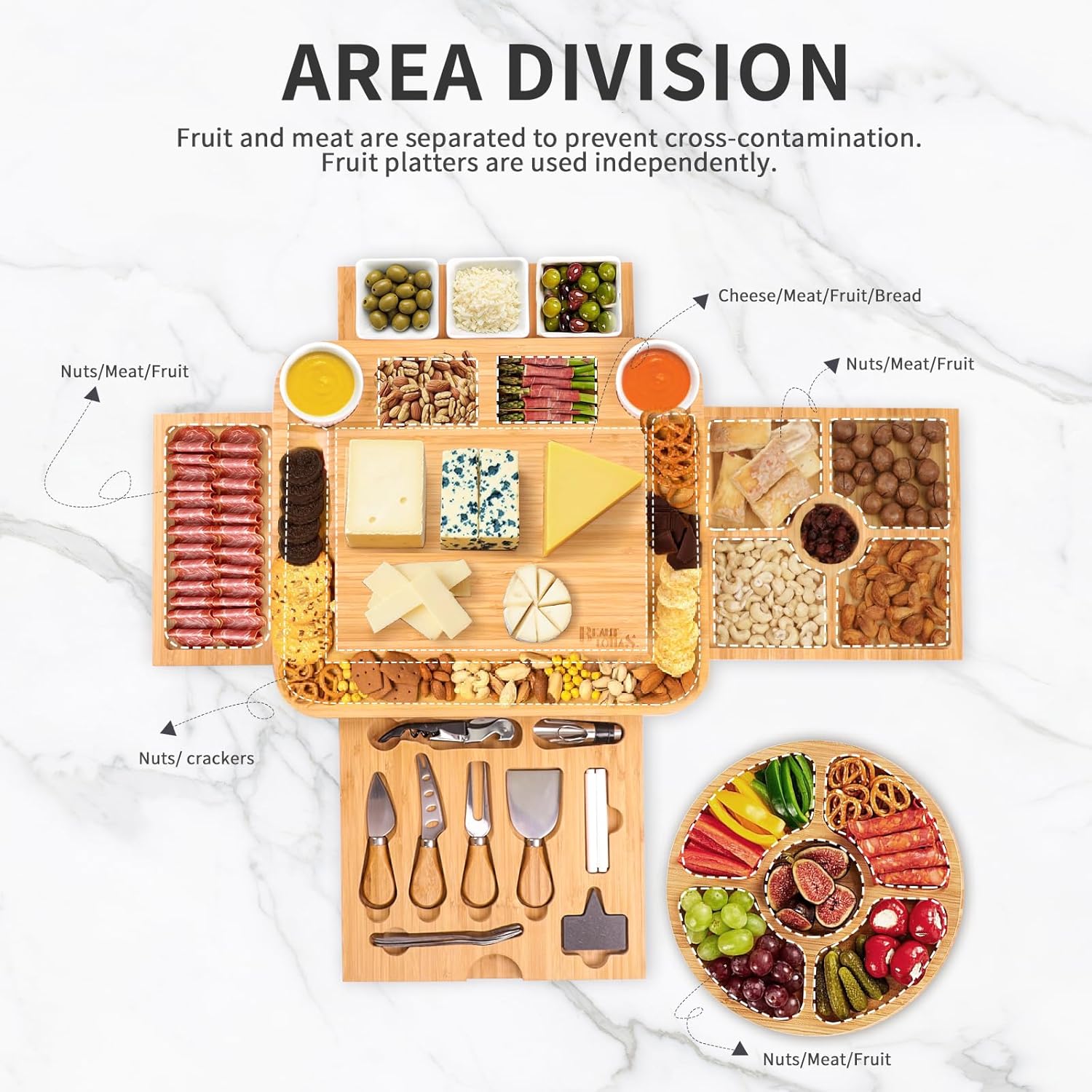 - Unleash your creativity - Own a main board plus a 3-sided drawer design plus a beautiful cheese platter. Can be separated and used separately. This unique cutlery set is carefully designed with hidden interior space for storing serving accessories to ensure the best entertaining experience. Let you and your guests enjoy your next gathering with a space where knives are safely stored. It comes with all the necessary accessories so that you can create amazing and delicious plating at any event.