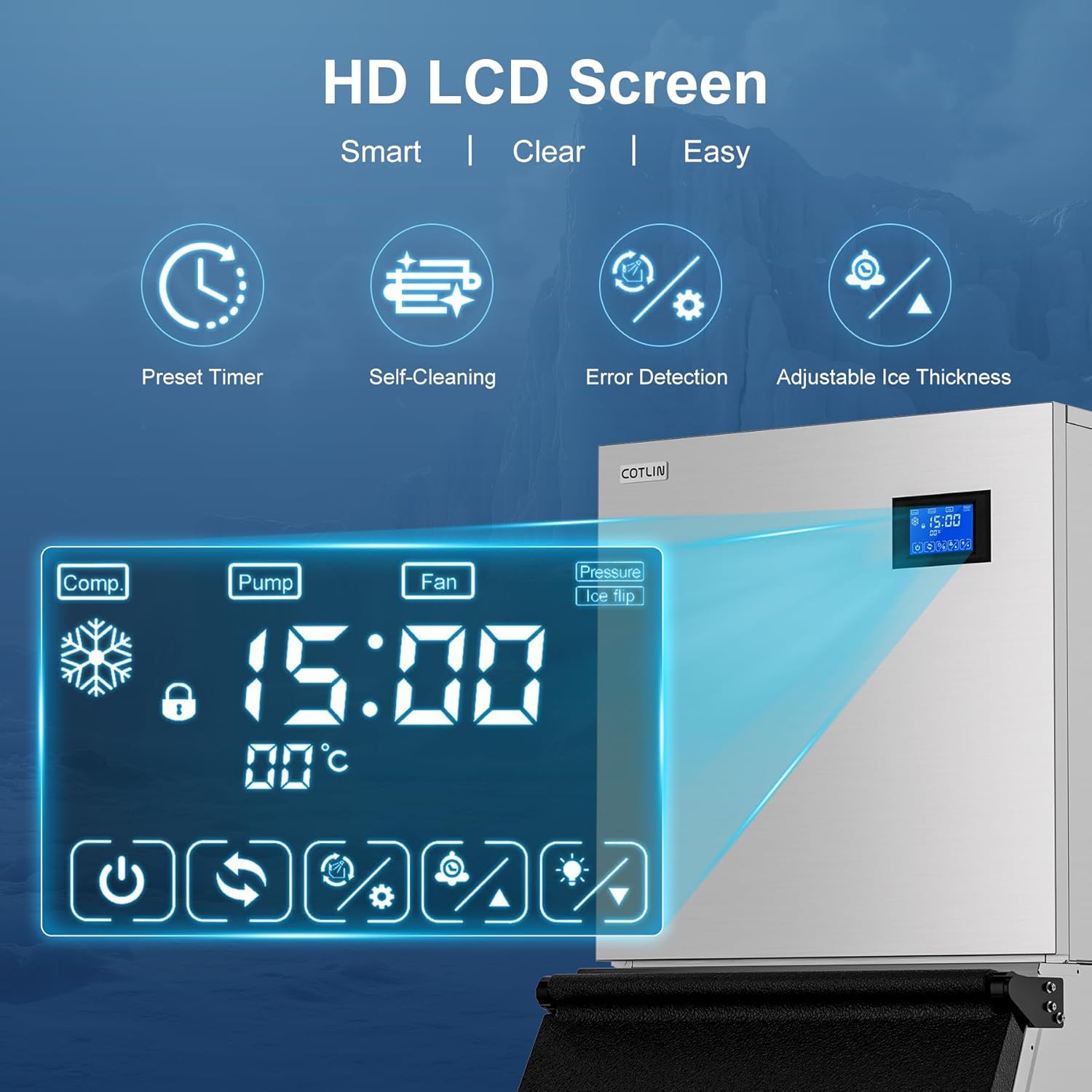 - 【User-Friendly Control】This commercial ice maker features an intuitive LCD control panel with a range of smart functions for smooth daily operation. Easily schedule ice production in advance with the timer function, adjust ice thickness as needed, activate automatic cleaning for easy maintenance, and rely on the built-in diagnostic system to detect and display potential issues in real time.