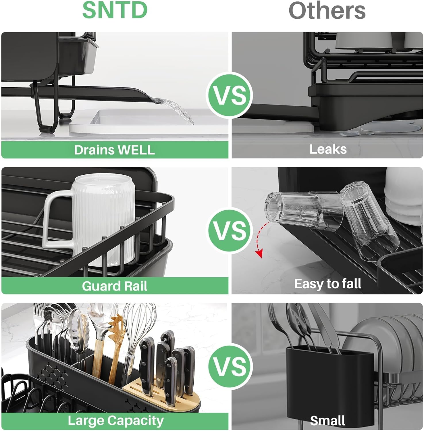 - Fast Drainage: Our dish rack features an angled drainboard that efficiently drains excess water directly into the sink. This design prevents puddles on your countertop and reduces drying time.