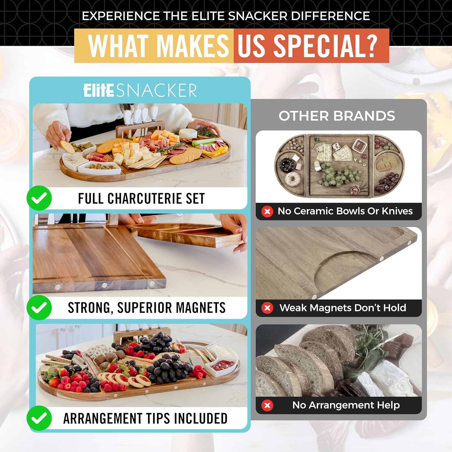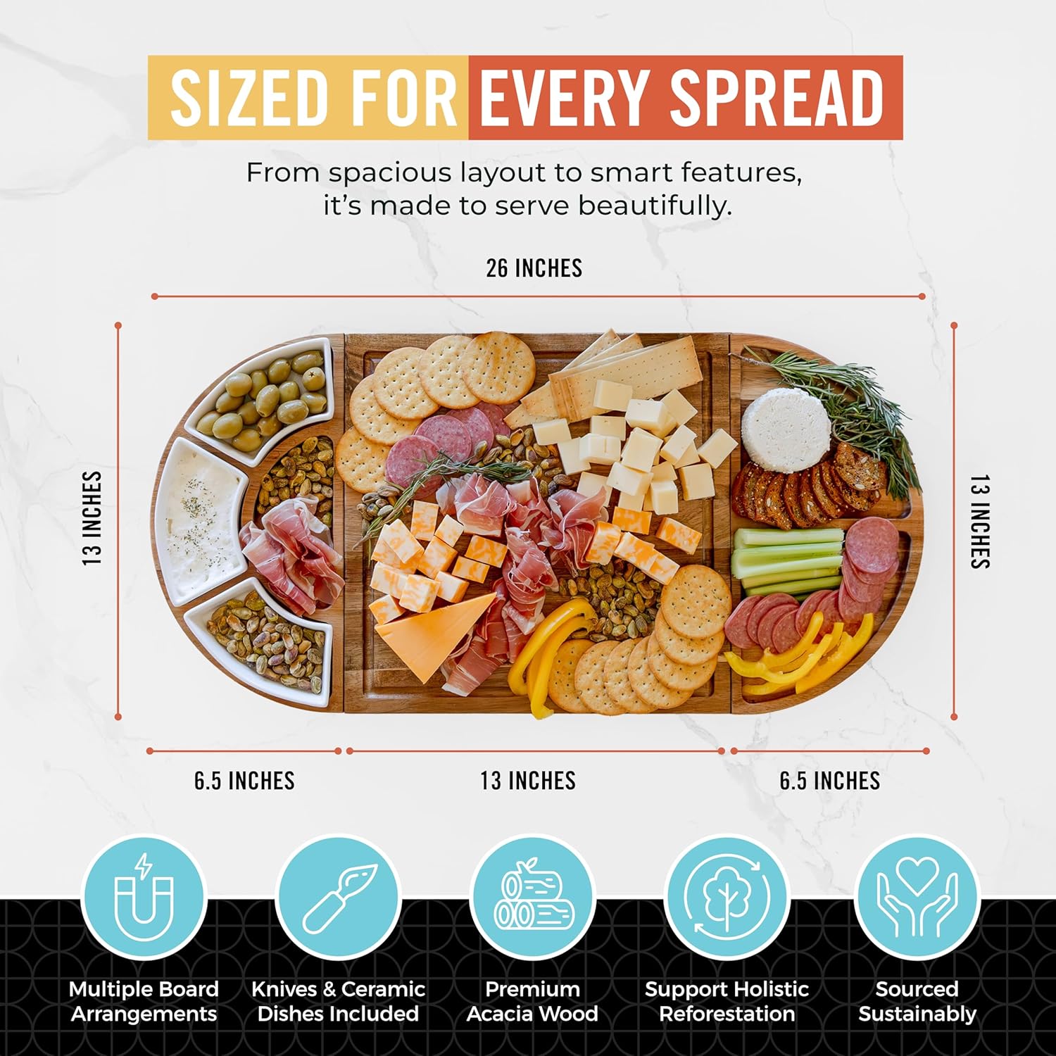 Large Wooden Charcuterie Board Set (Oil Finish) - 3-Piece Magnetic Long Serving Board Tray with Charcuterie Accessories - Acacia Wood Cheese Platter with Cheese Knife Set & Ceramic Dishes - Brown