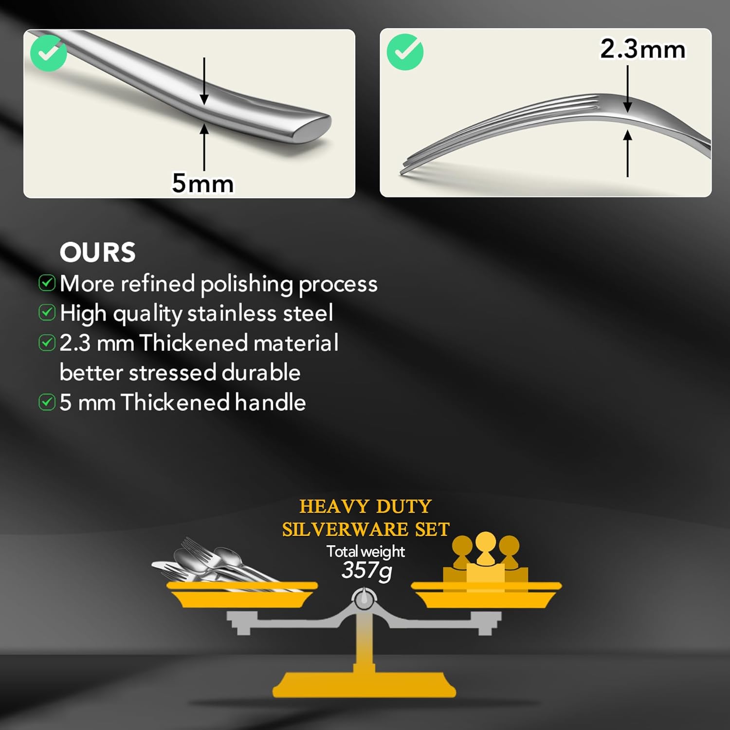 - 【Stainless Steel Silverware Set Heavy Weight】The forks and spoons silverware set is approximately 2 times thicker than a regular cutlery sets. More solid construction ensures everyday usage and durability, no worry about bending. The weighted silverware is made of high-quality stainless steel, which has great anti-corrosion and rust resistance to ensure eating health. Enjoy the benefits of stunning and reliable utensil sets for years to come