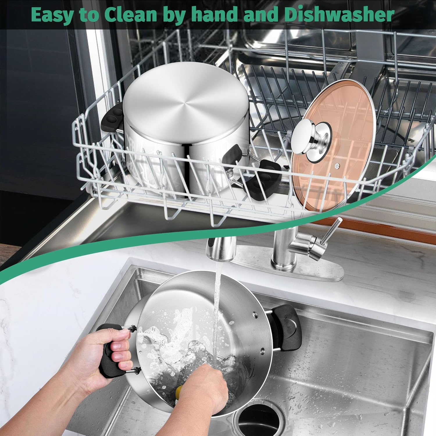 - 【Easy To Clean】Both brushed surface interior and mirror finished surface exterior can reduce the risk of food sticking and provide a smooth touching, 3-ply Bases get rids of burning of the food, The pot and lid have smooth edges with no sharp place and no dead corner, Will not hurt your hands and not hide dirt when using and cleaning, Easy to clean by hand, And dishwasher safe to keep away from the hassle of doing dishes, Free your hands and saving your labor and time when you are busy
