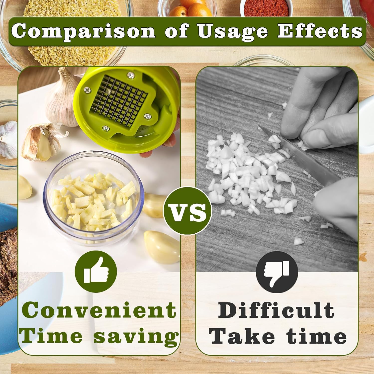 - Versatile usage: This garlic chopper mini is suitable not only for garlic but also for chopping onions, peppers, cucumbers. Its compact design facilitates storage without occupying much space